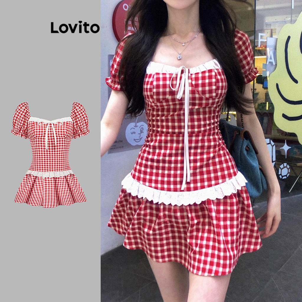 (Trendy) Lovito Vestido Xadrez Com Babados E Decote Em Laço Drapeado Vestido De Manga Bufante Para Mulheres L114AD416