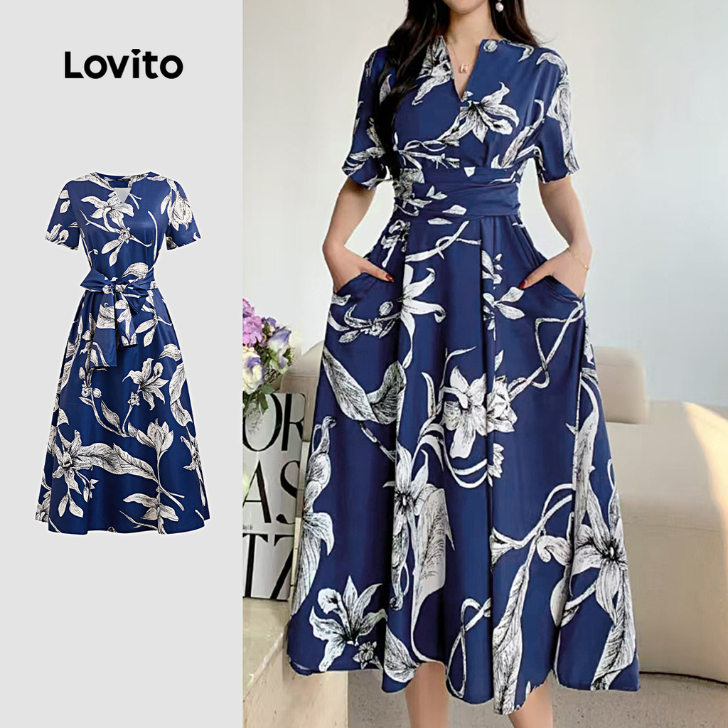 Lovito Vestido Casual Azul E Branco Com Cinto Para Primavera/verão L149ED1017