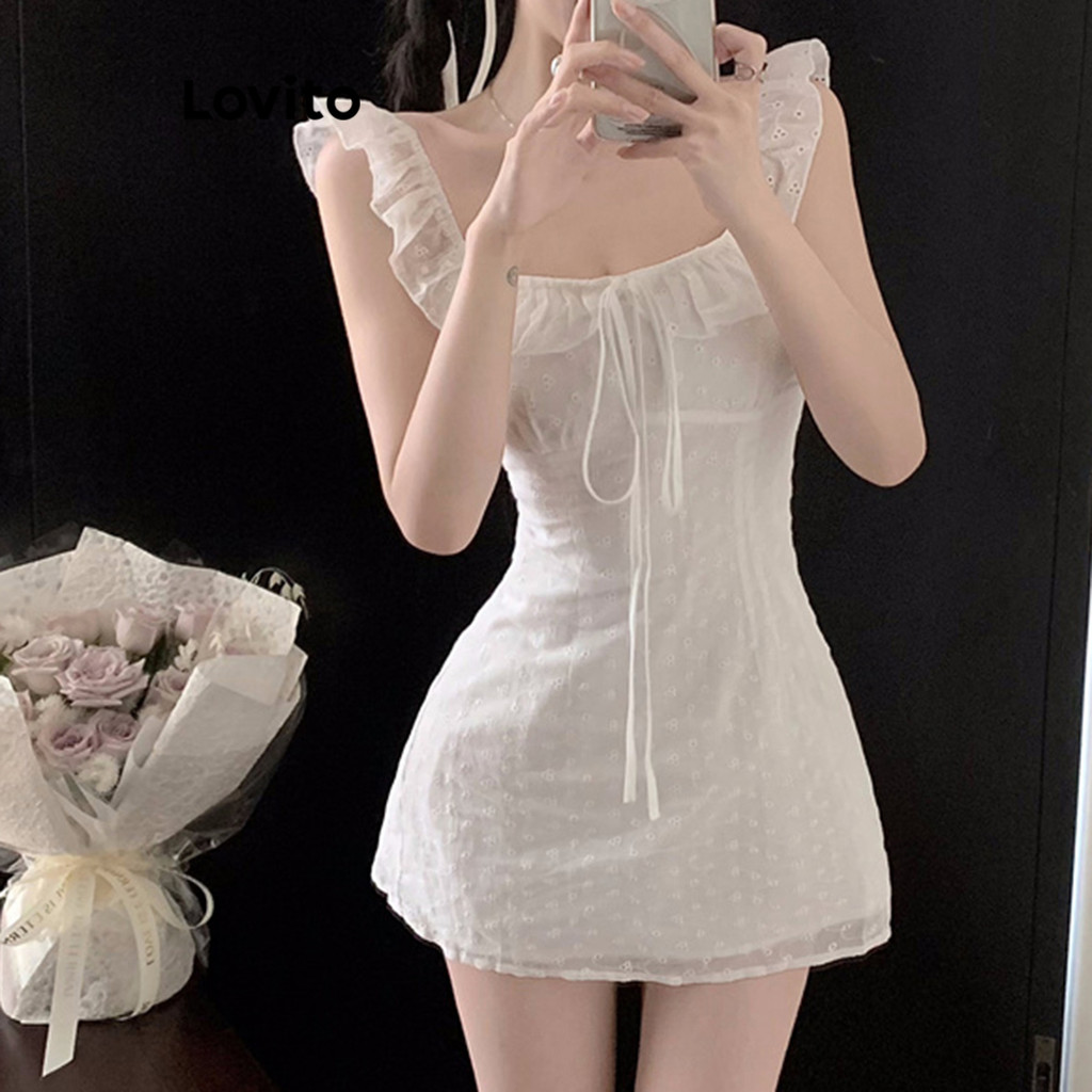 Lovito Vestido feminino elegante com bordado de ilhós frontal e detalhe de laço L122AD063