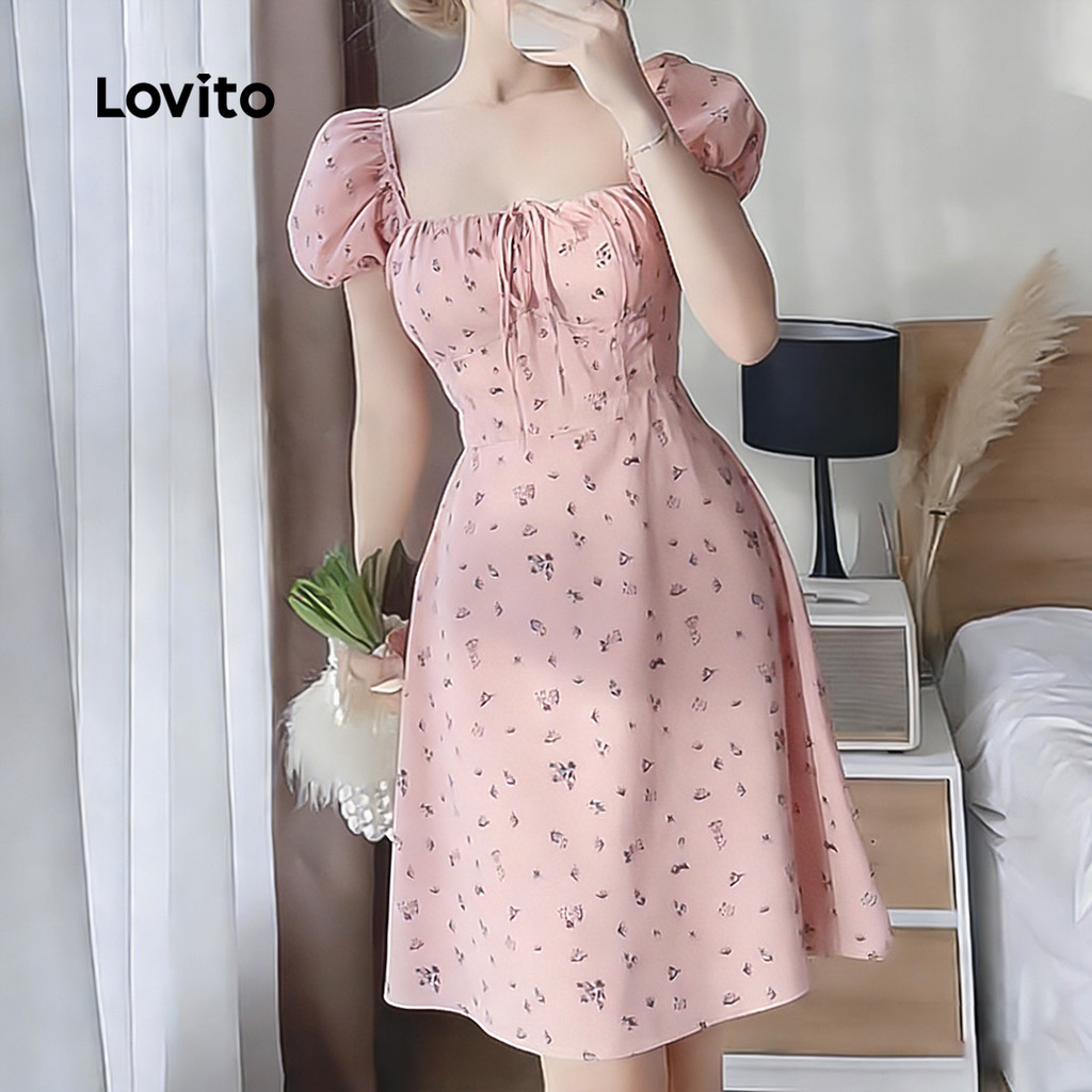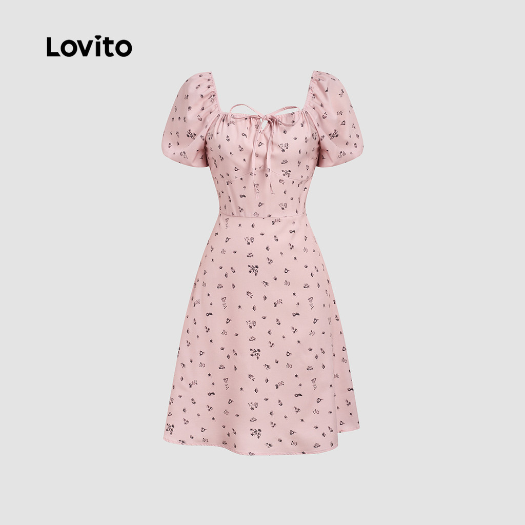 Lovito Padrão de Vestido Casual Plissado com Laço Frontal Primavera/verão Vestido Rosa para Mulheres L177ED134
