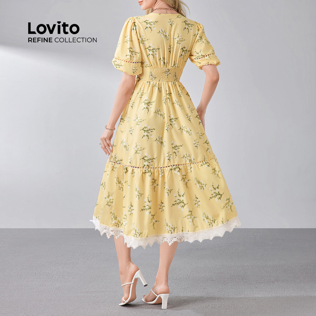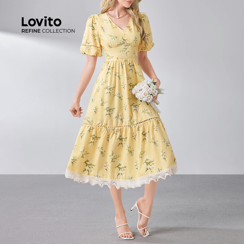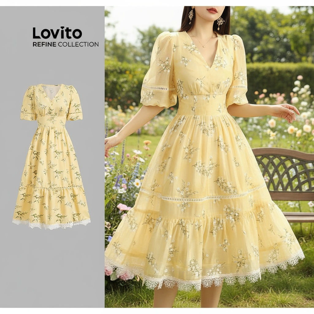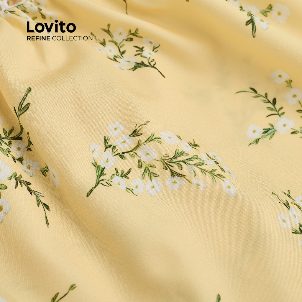 (Lovito Refine) Vestido sofisticado com zíper, gola plissada, dupla camada, para primavera/verão, amarelo, LR13L170