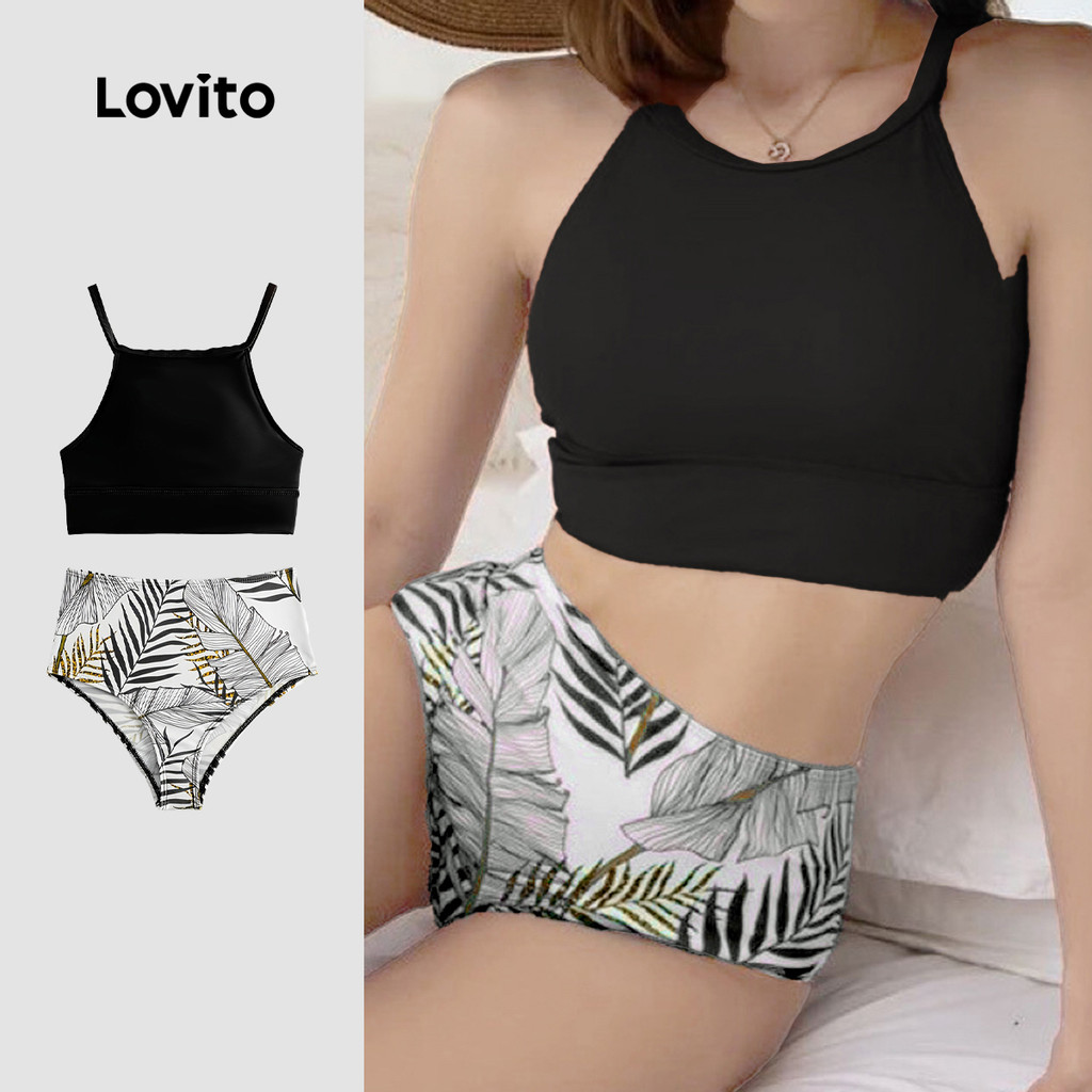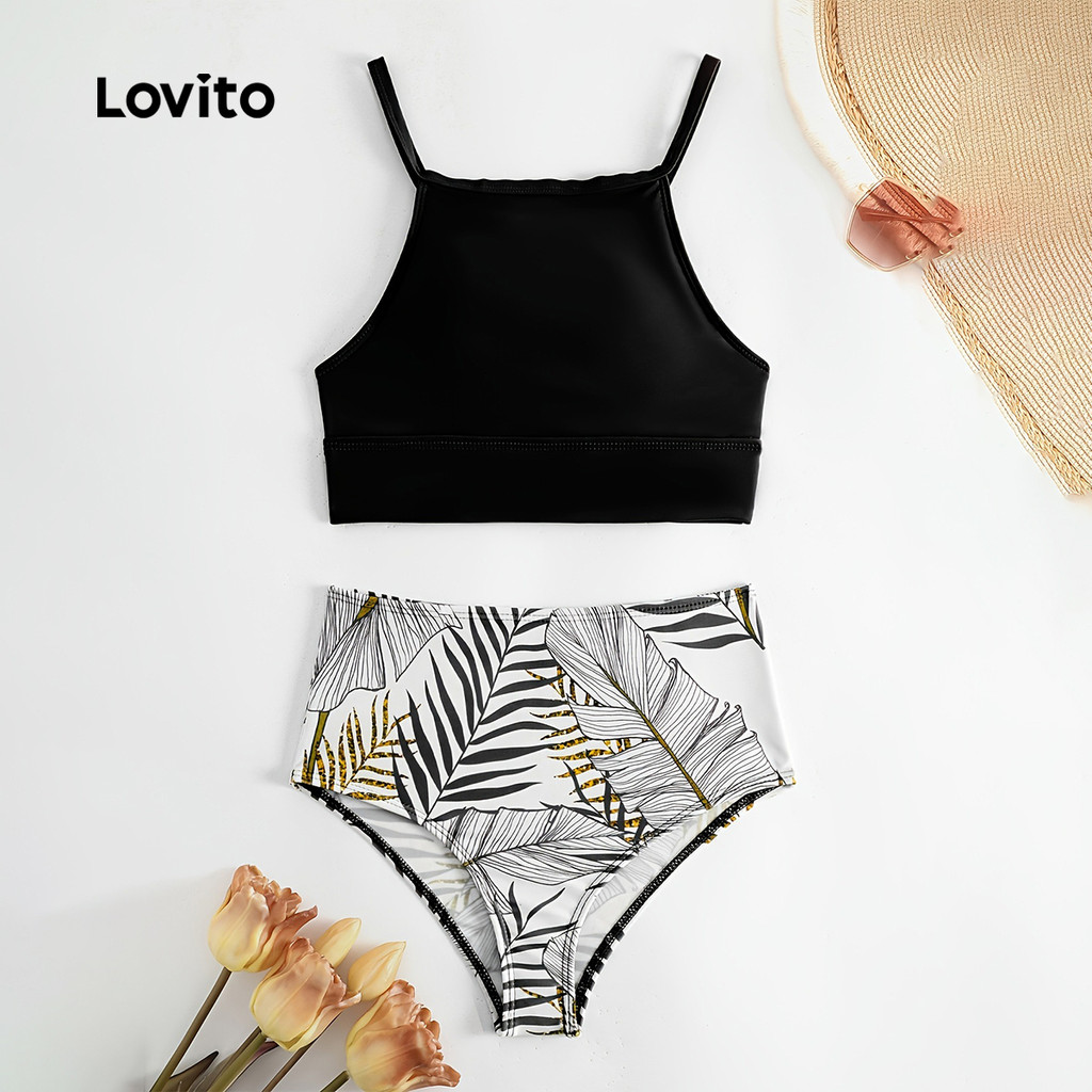 Lovito Conjuntos de Biquíni Sexy com Fivela para Primavera/verão Biquíni Preto para Mulheres LNE126015