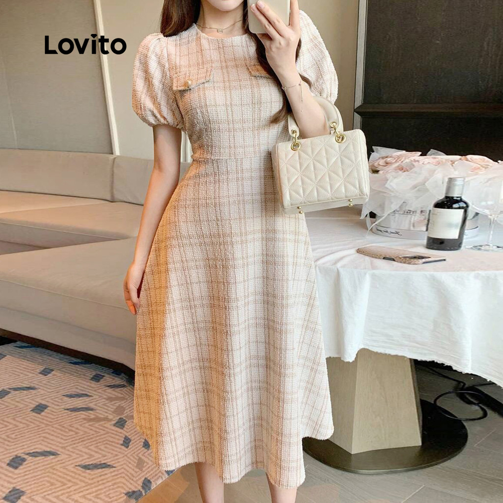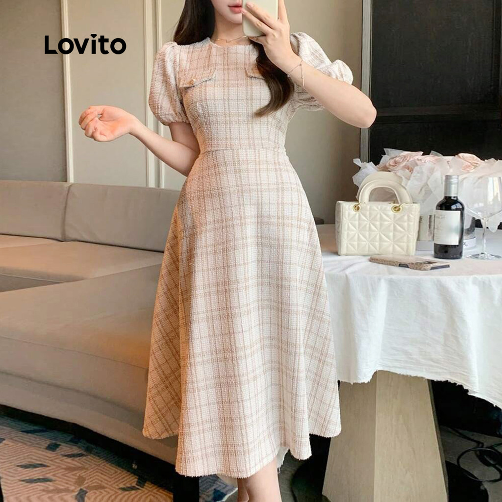 Vestido com botão de impressão xadrez-DRB150PAD1619
