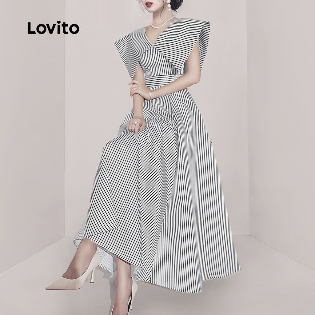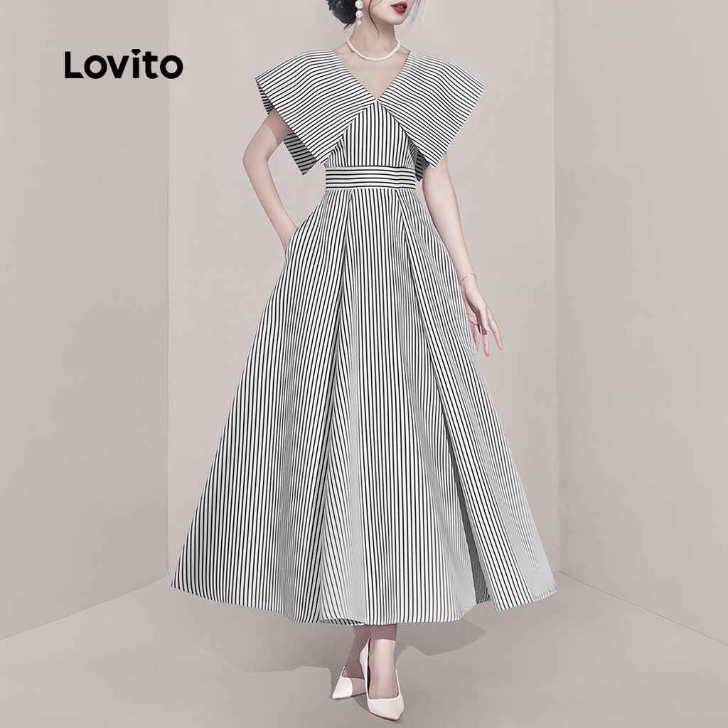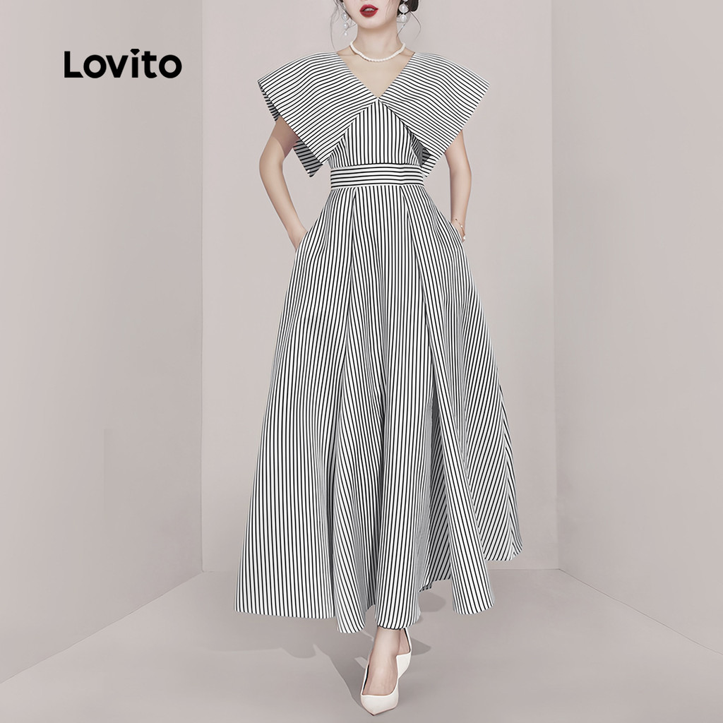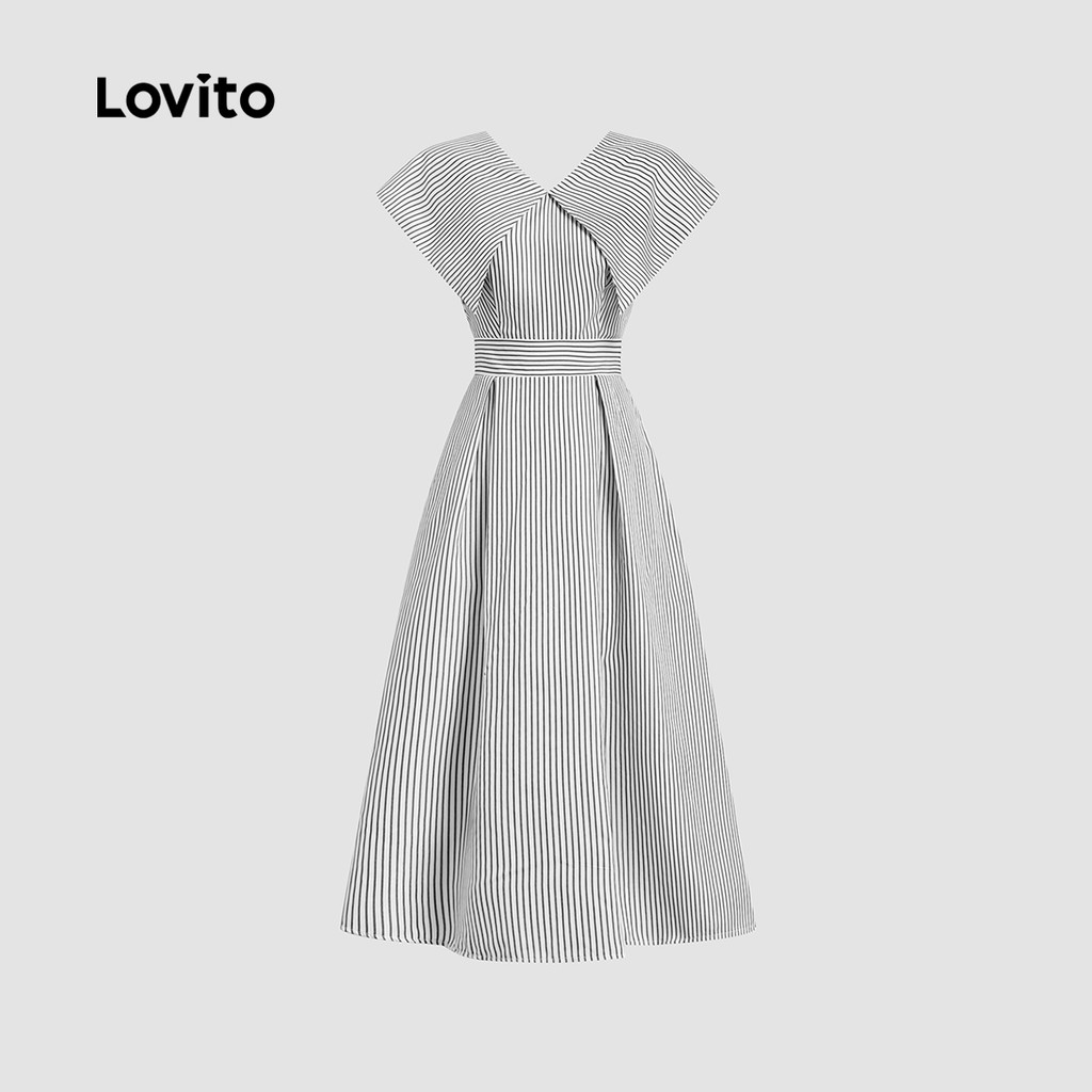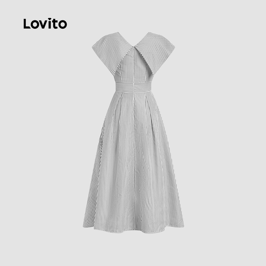 (Trendy) Lovito Elegante Listrado Retro Estrutura Linha Verão Primavera Vestido Preto E Branco Para Mulheres L134ED207