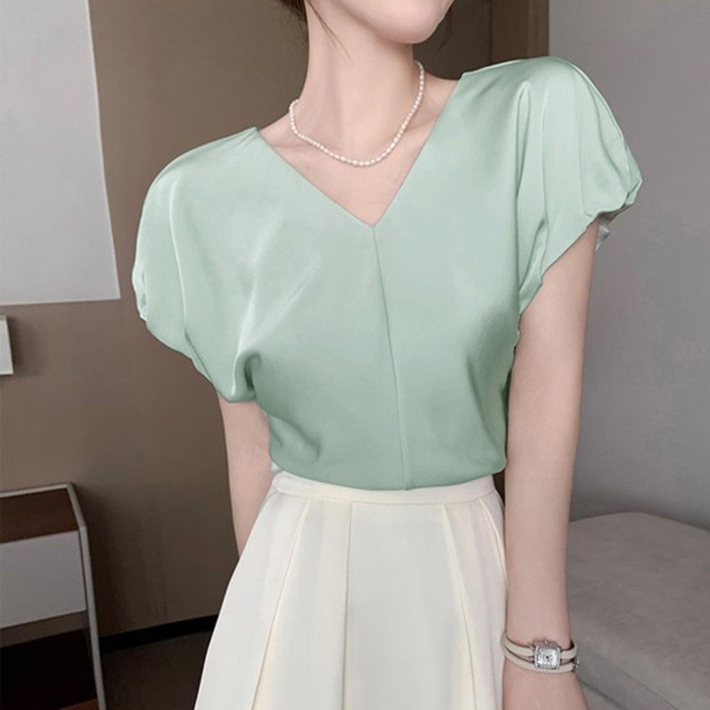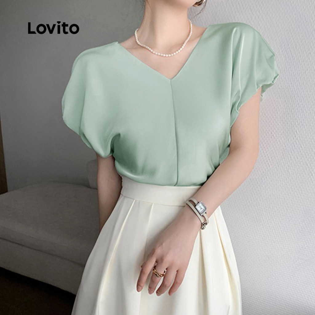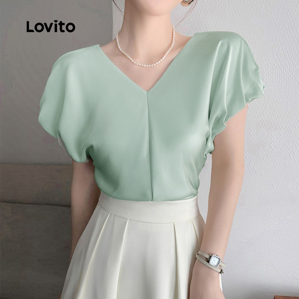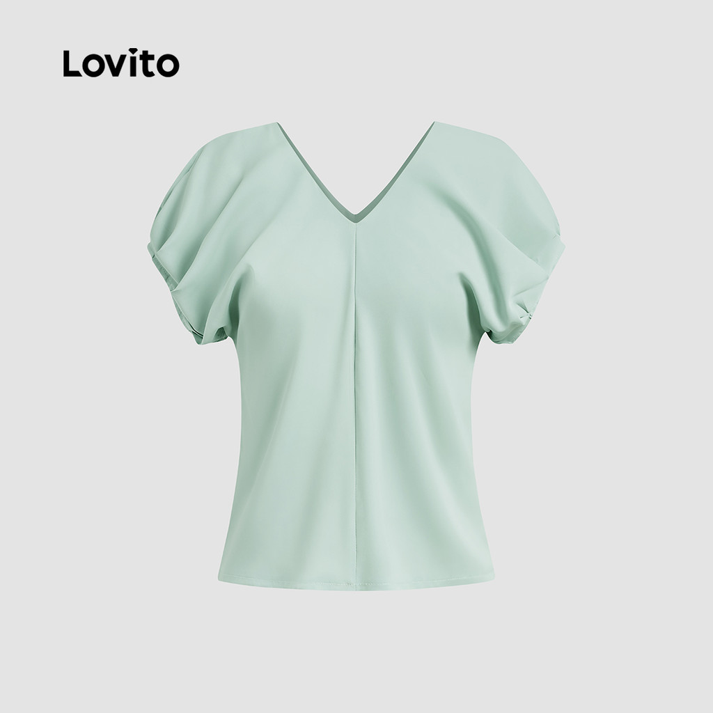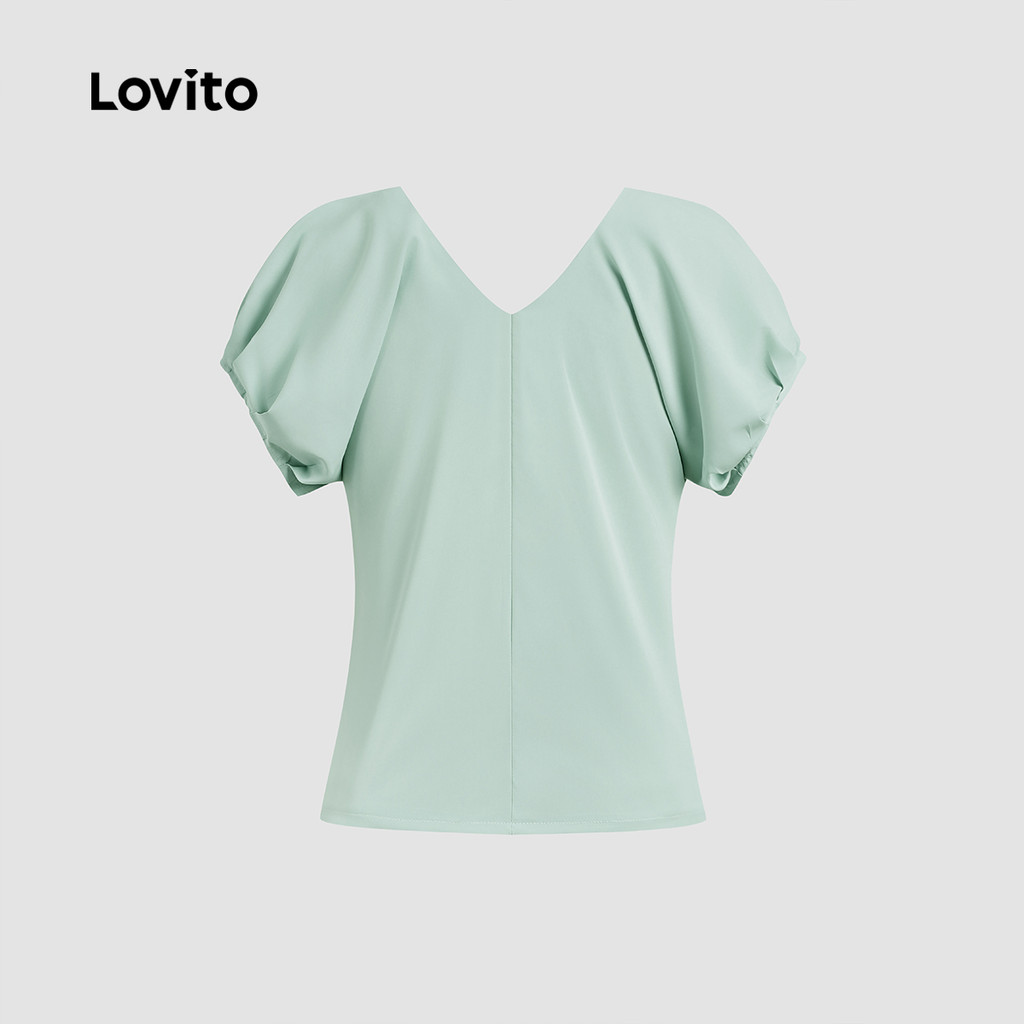 (New) Lovito Blusa Elegante com Drapeado Simples para Primavera/verão Verde para Mulheres L142ED087