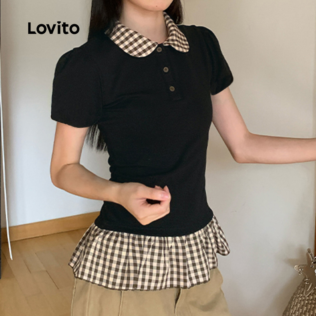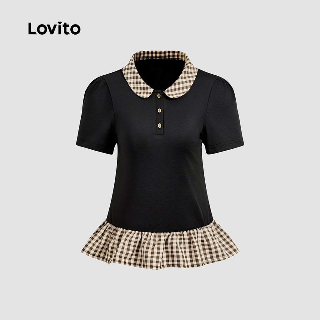 Lovito Camiseta Casual com Gola Contrastante e Babados Manga Curta para Primavera/verão para mulheres L151AD398