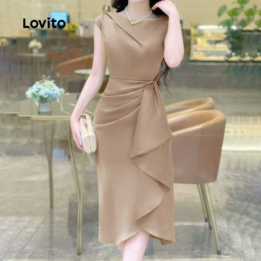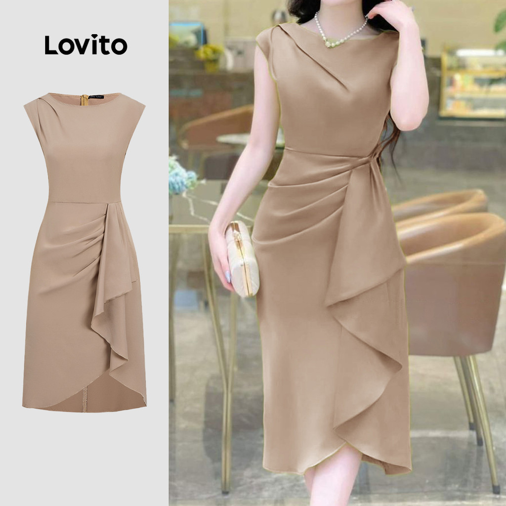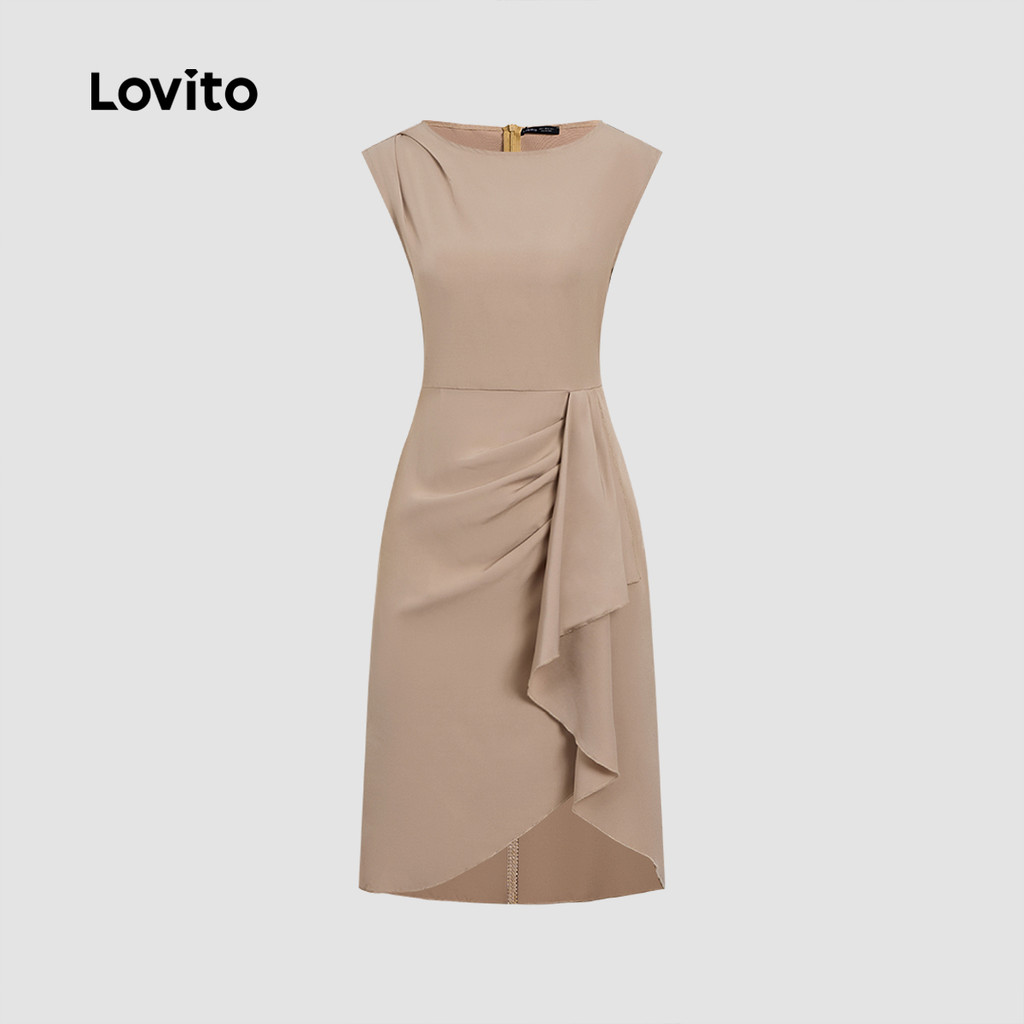 Lovito Vestido Feminino Elegante Assimétrico com Pregas para Trabalho Primavera/Verão Caqui L155ED1811