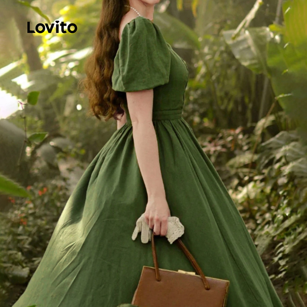 Lovito Vestido Verde Feminino Primavera/verão Elegante com Babado e Botões Na Frente Confortável e Estiloso L172ED1661