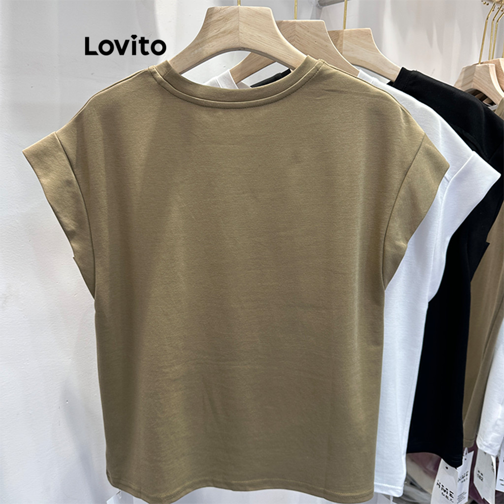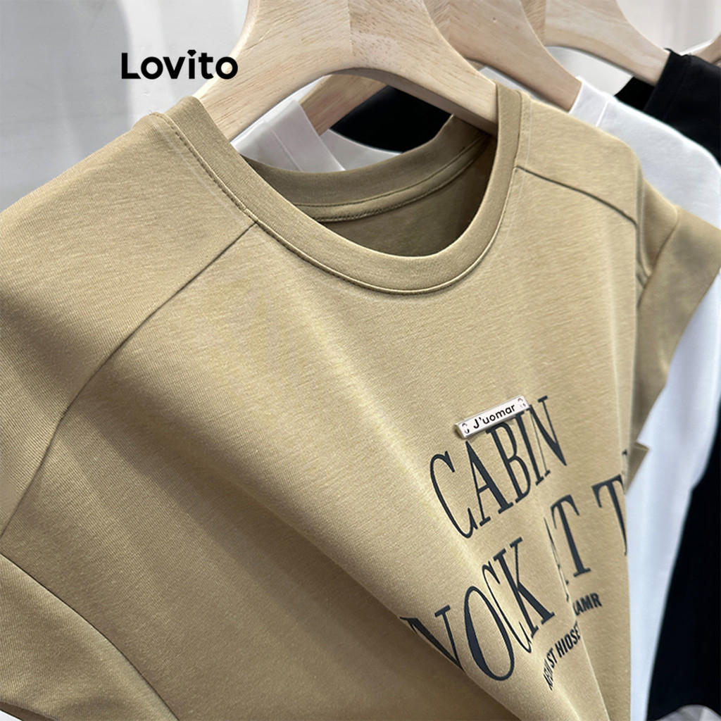 (Trendy) Lovito Camiseta Casual Acolchoada Com Letras Básicas Para Mulheres LNA24019 (Cáqui/Branco/Preto)