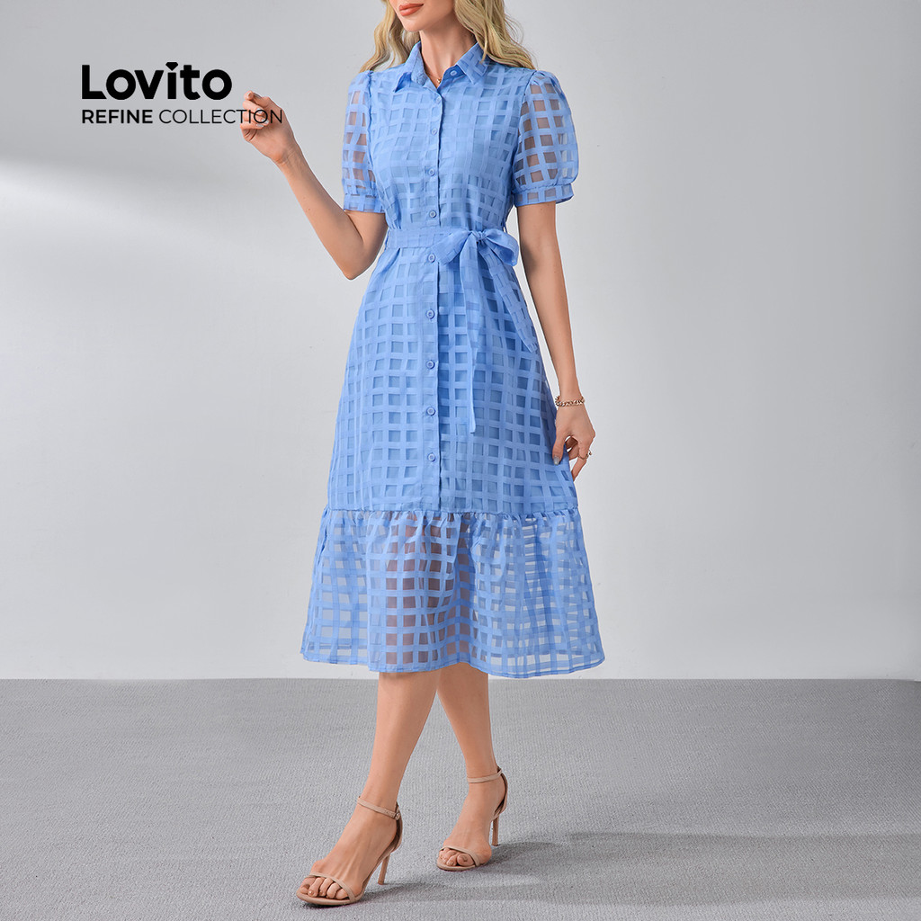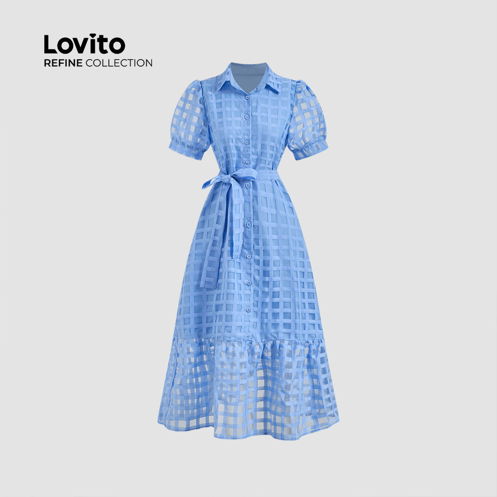 (Lovito Refine) Vestido Elegante de Botões com Cinto para Primavera/verão Azul para mulheres LR13L065