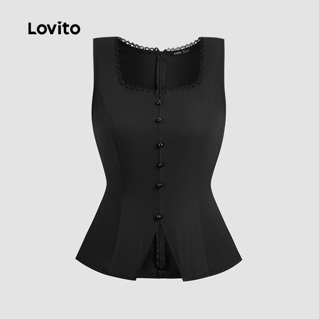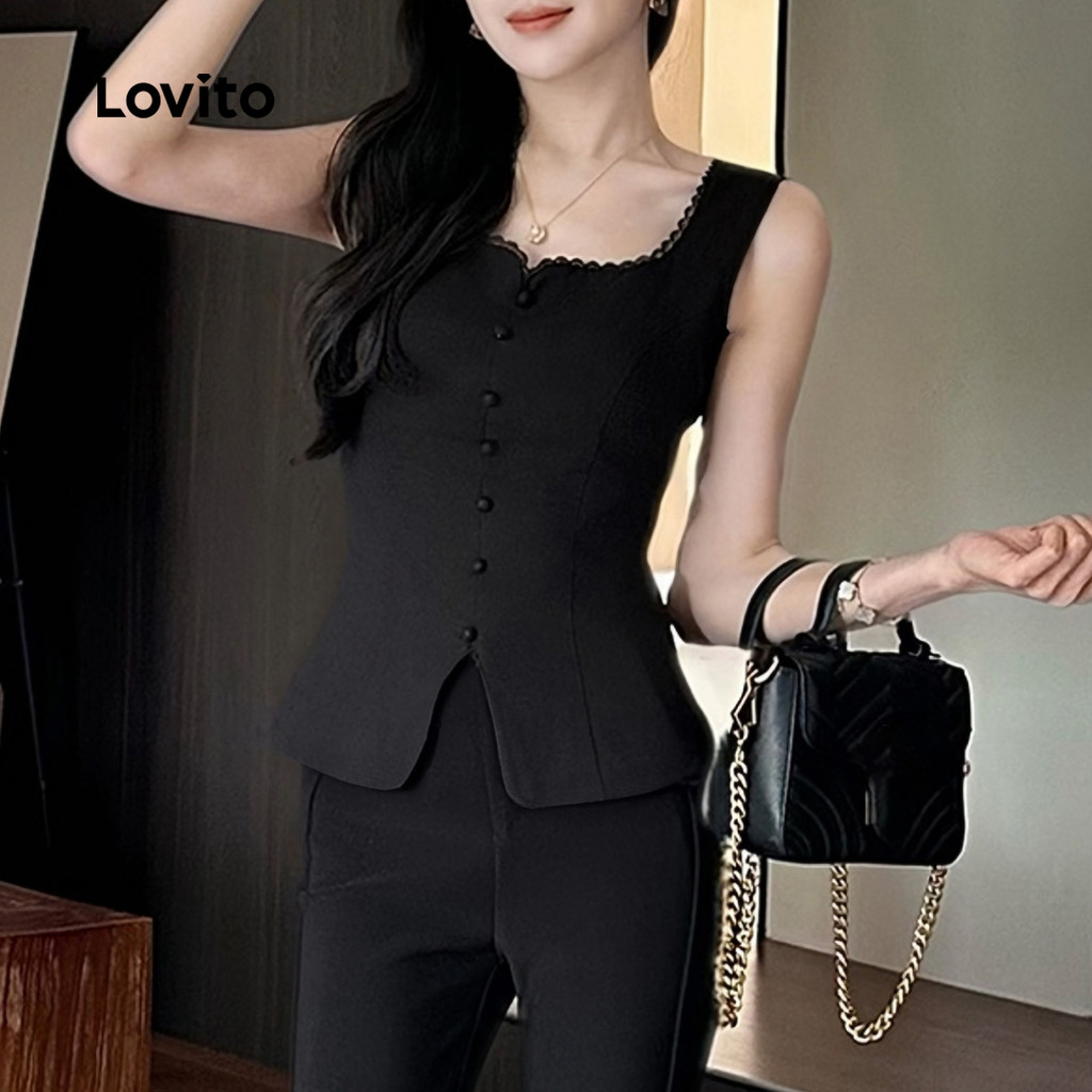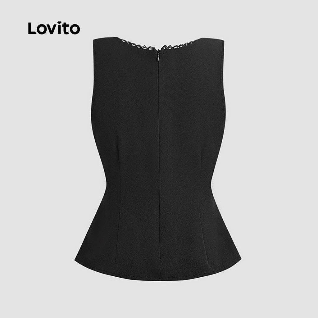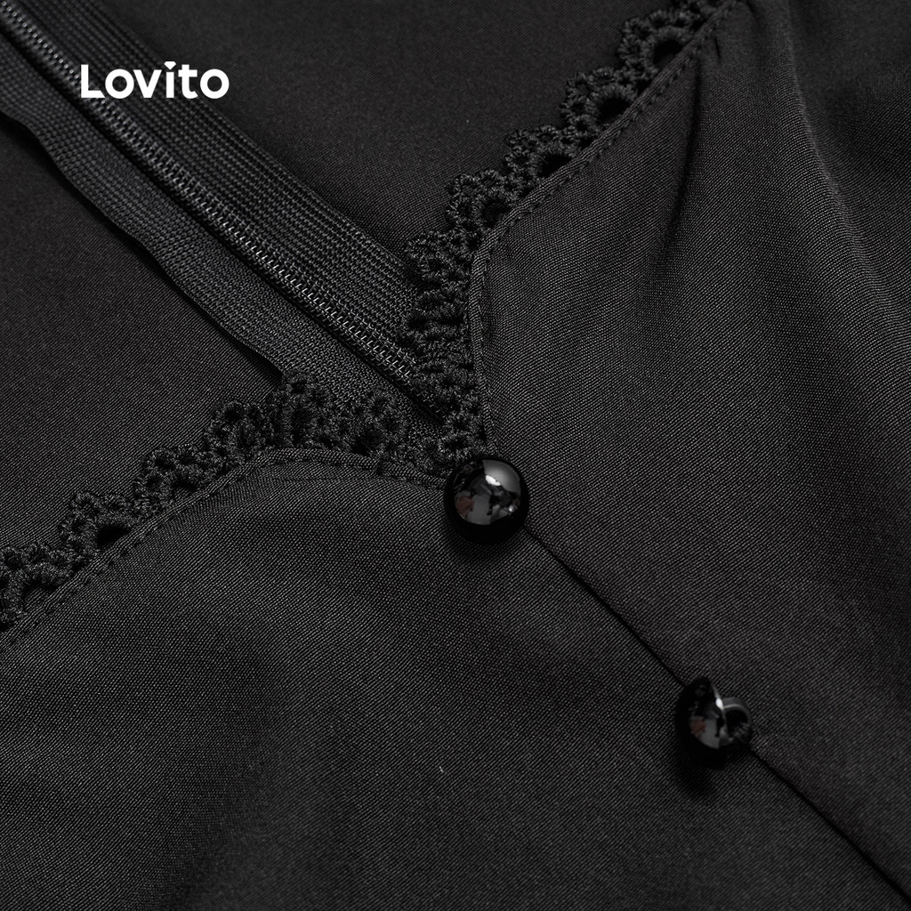 (New) Lovito Blusa Elegante com Gola Bufante Decote Cimalha e Fenda Primavera/verão Preta para mulheres L143ED506