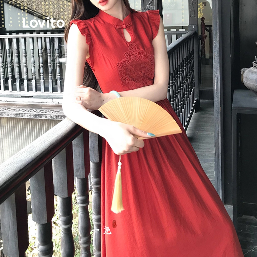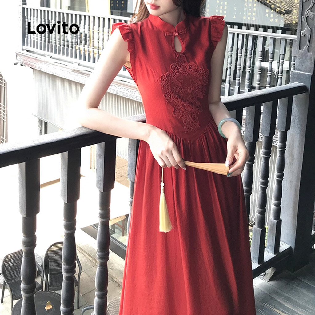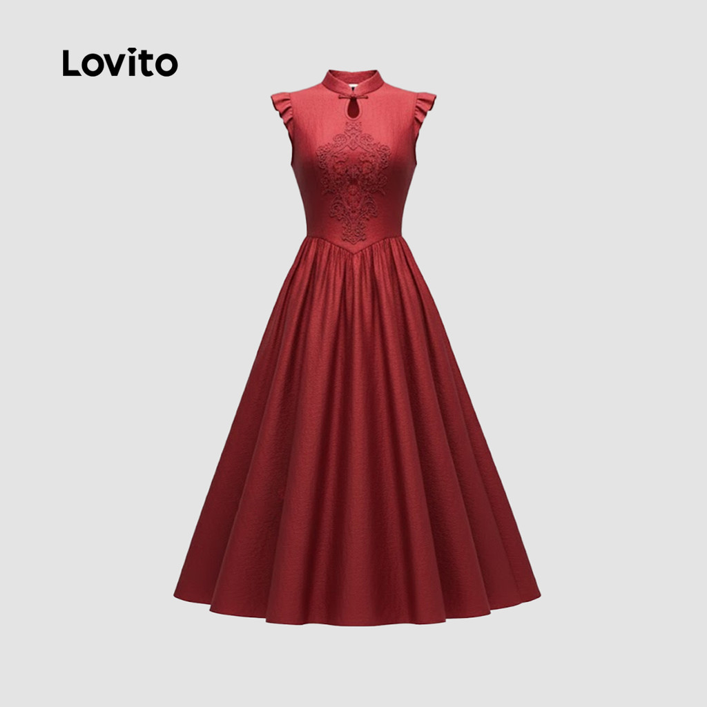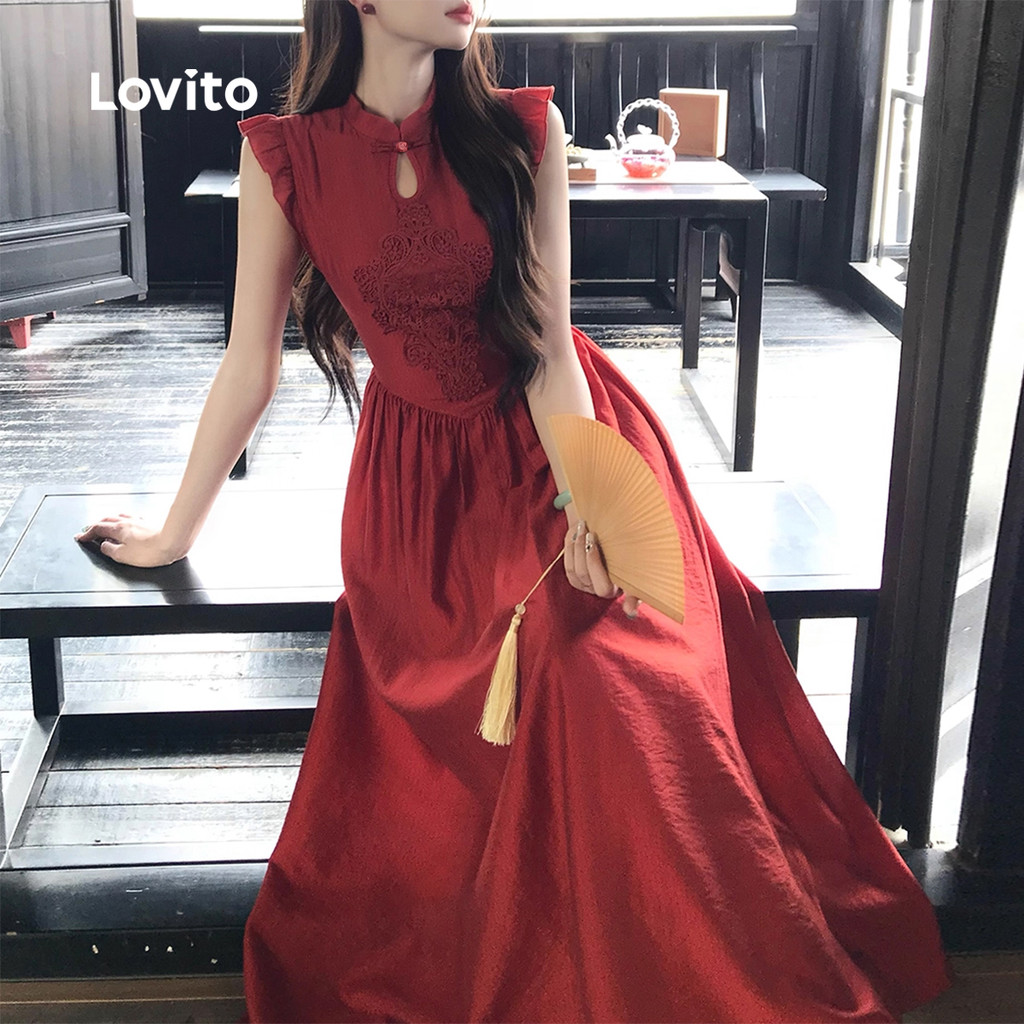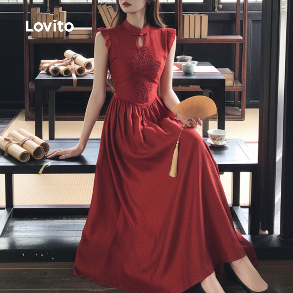 Lovito Vestido Elegante De Festa Novo Estilo Chinês Cor Vinho Para Mulheres Ideal Para a Primavera/verão LK2ED445