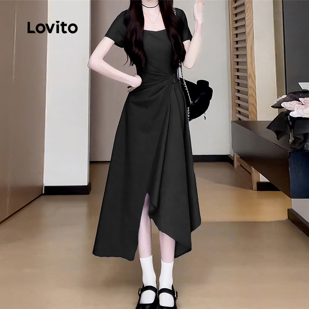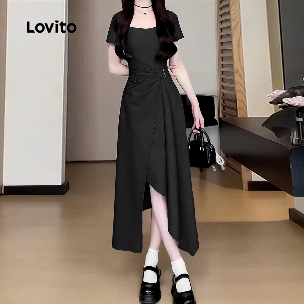 Lovito Vestido Fofo Plissado Primavera/verão Preto para mulheres L166AD975