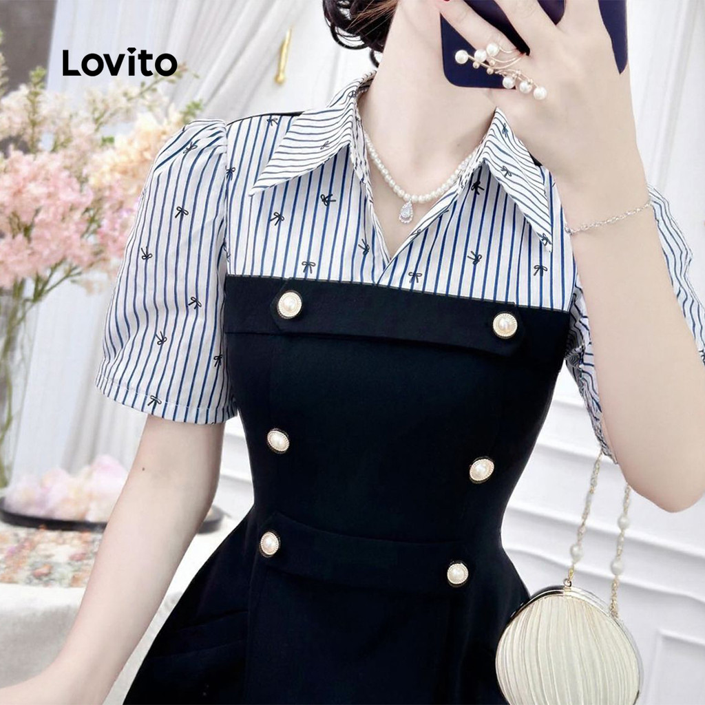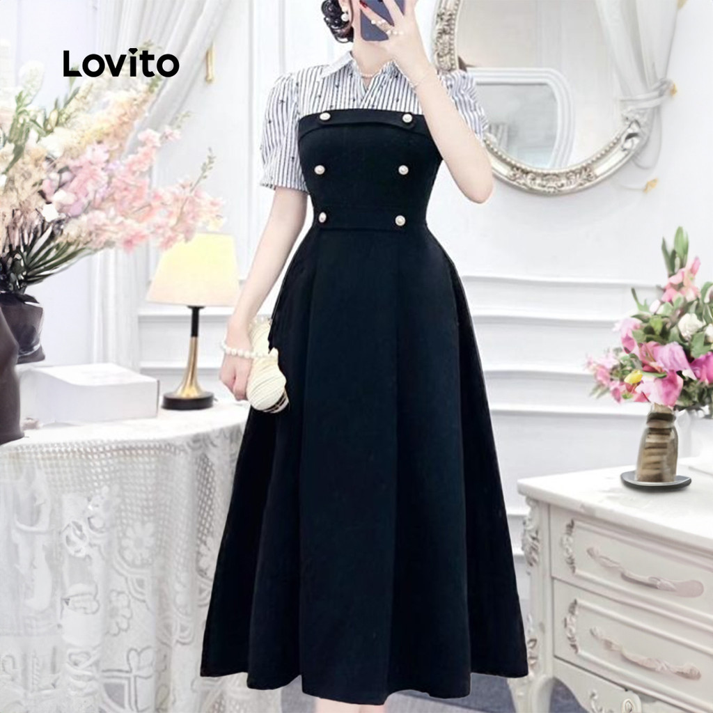 Lovito Vestido Elegante de Tecido com Costura e Botão Duplo para Primavera/verão Preto para mulheres LK2ED1344