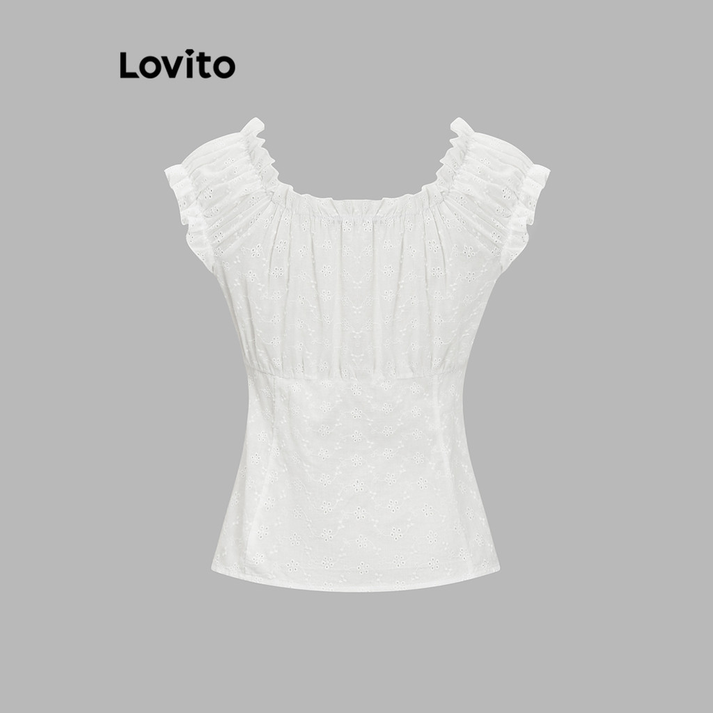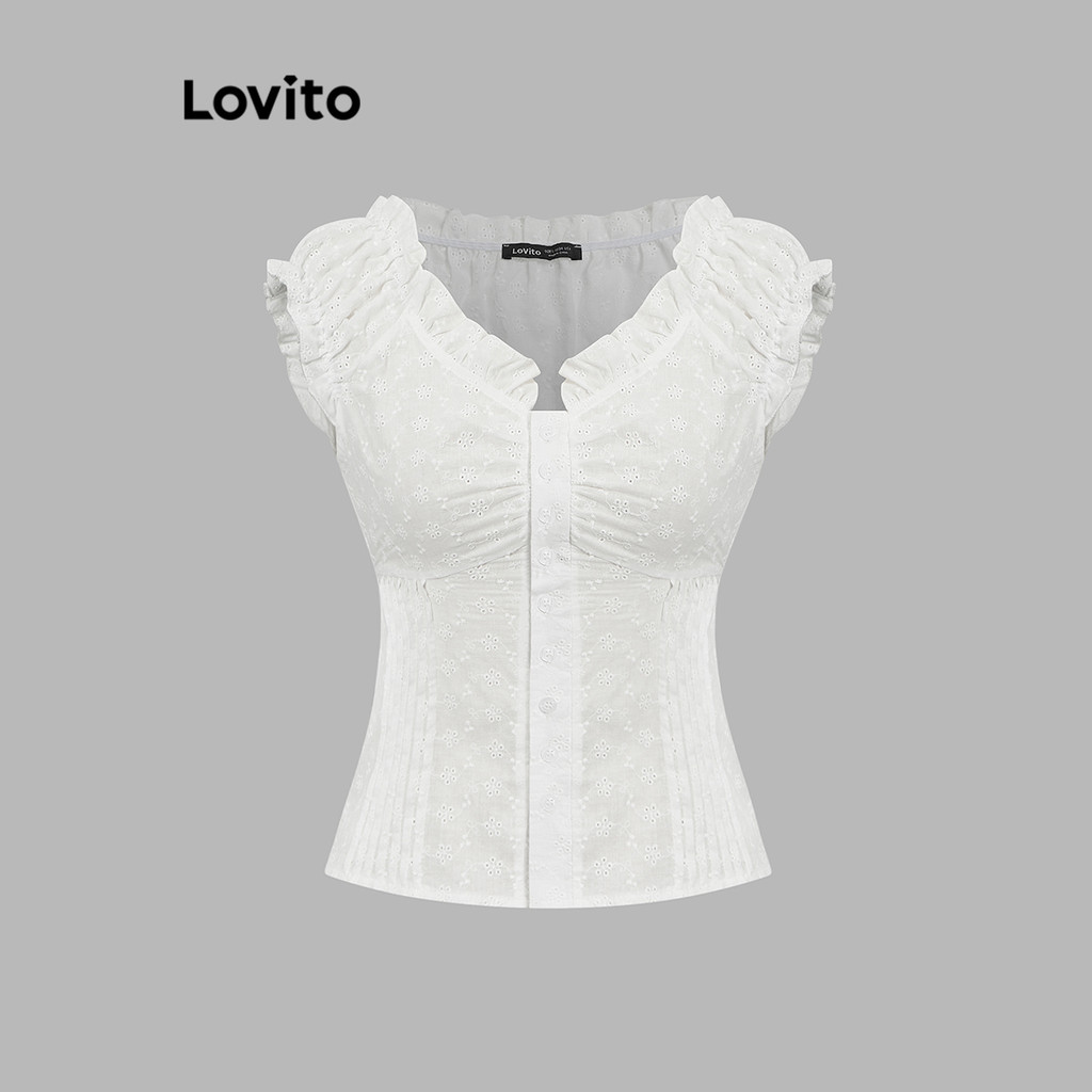 Lovito Blusa Casual Lisa com Borda de Alface e Botões Frontais Plissada para Mulheres L80ED008