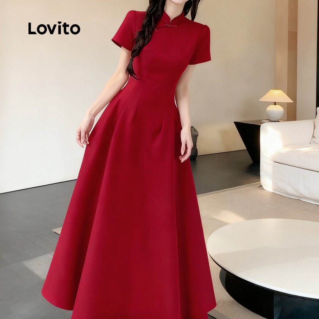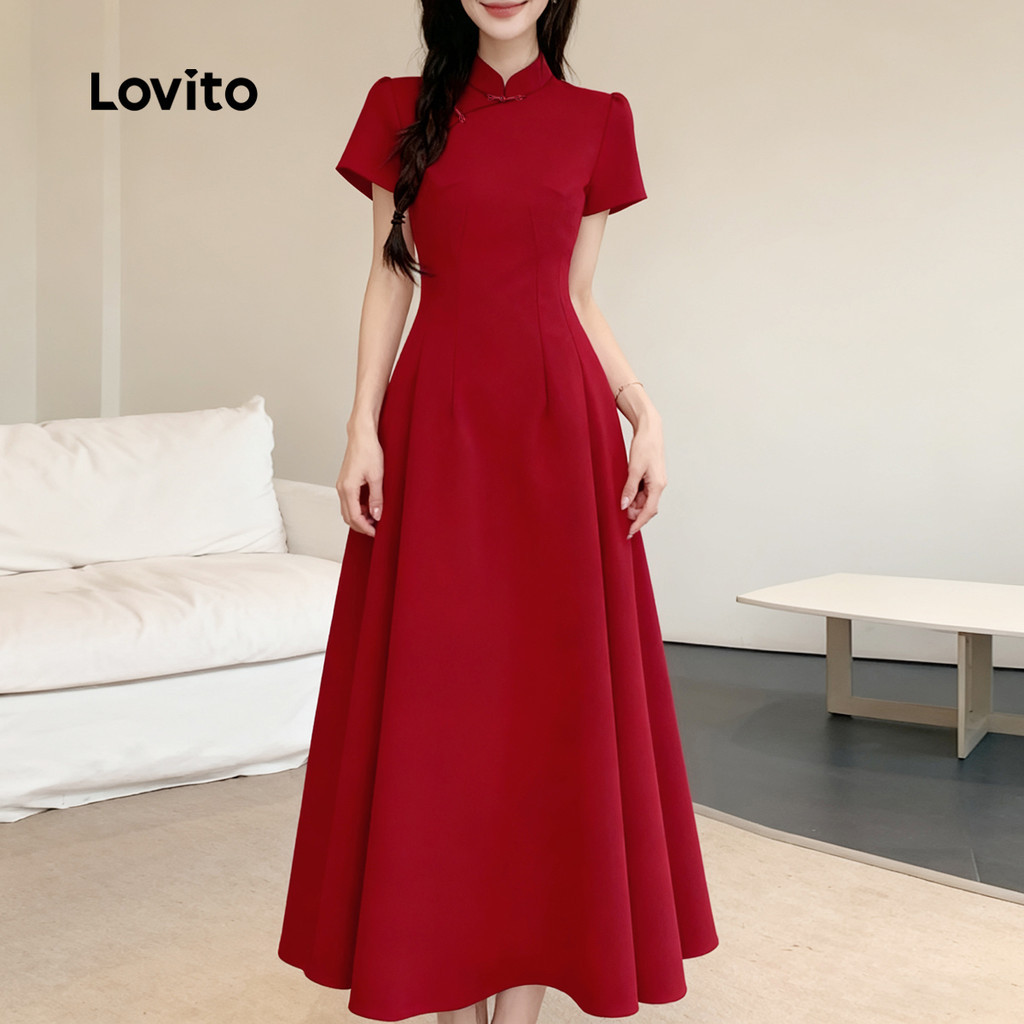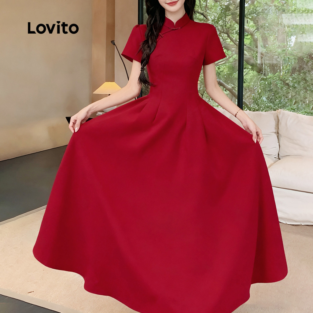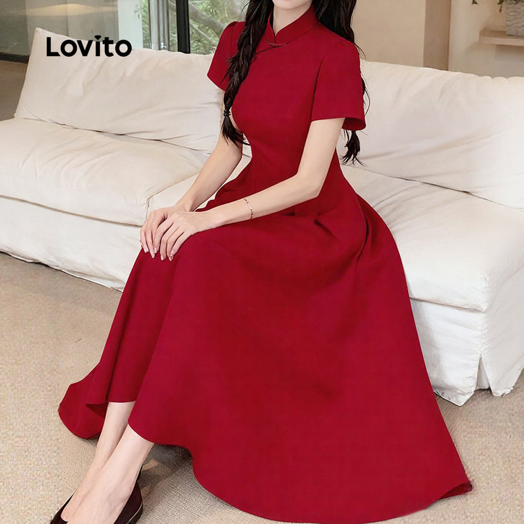Lovito Vestido Casual Estilo Chinês Cheongsam Qipao Vermelho Diário Primavera/verão Cor Vinho Para Mulheres LK2AD227