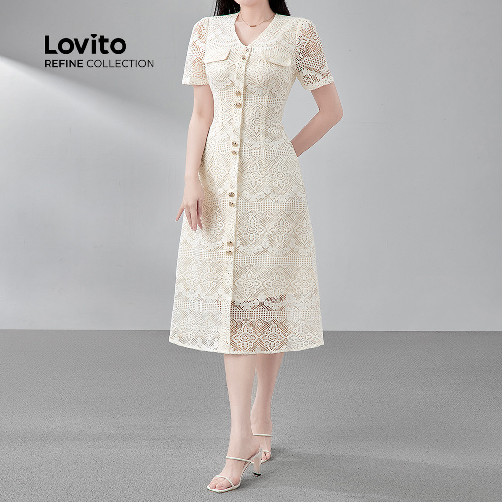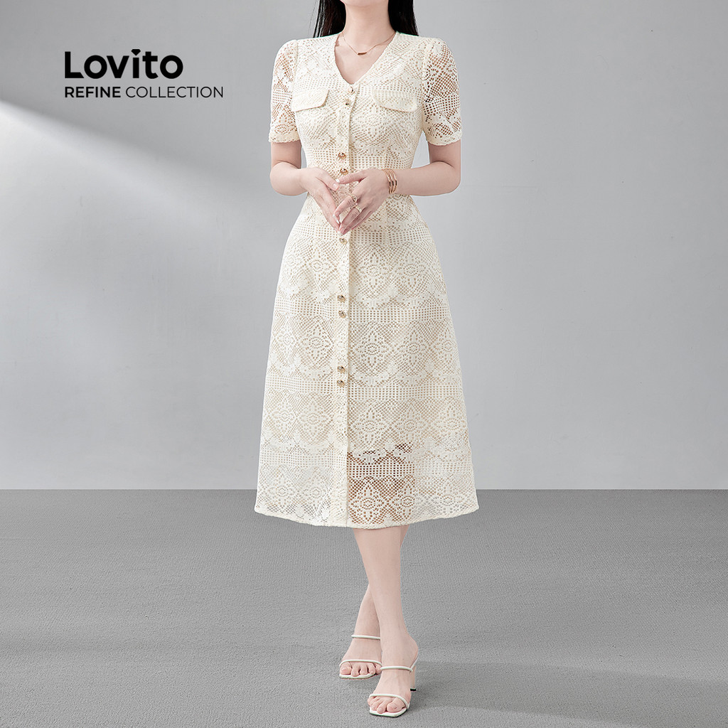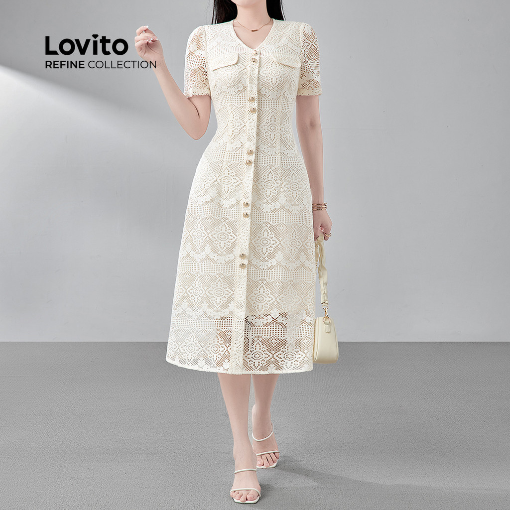 (Lovito Refine) Vestido Elegante com Botão Primavera/verão Vestido Branco para mulheres LR23E427