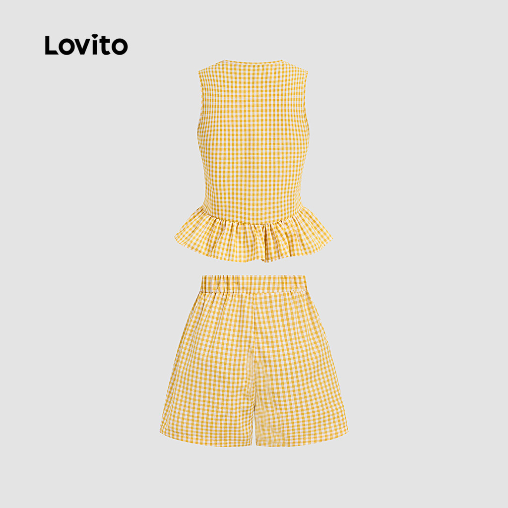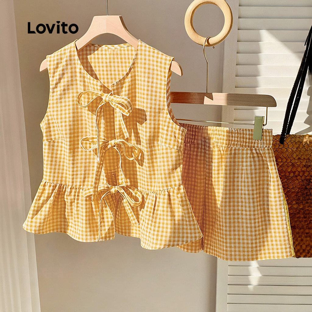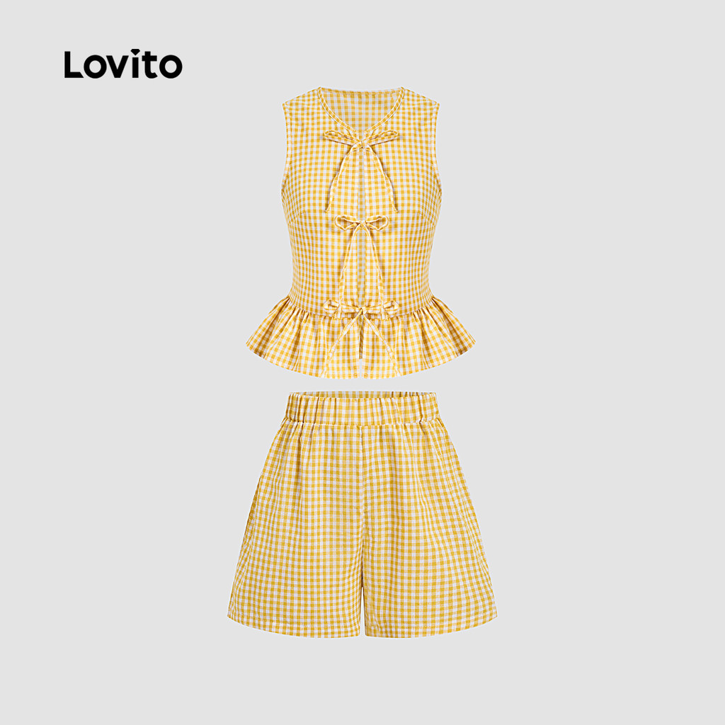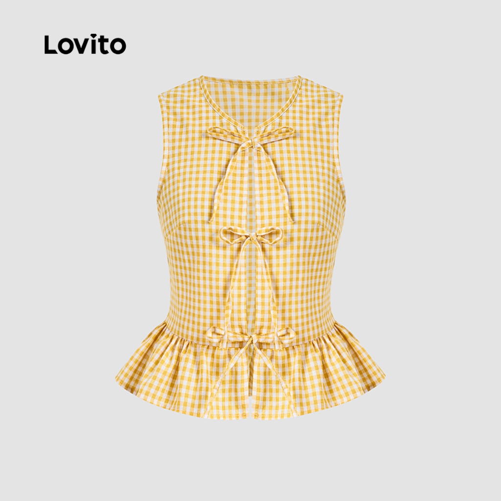 Lovito Blusas ou Calças Femininas Casuais com Laço Primavera/verão Top Amarelo L154LD122