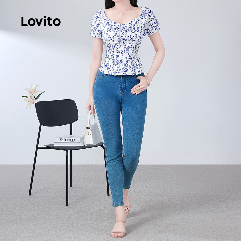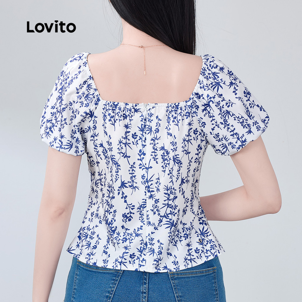 Lovito Blusa Casual Botão Frontal Franzida Primavera/verão Blusa Azul para Mulheres L172LD1174