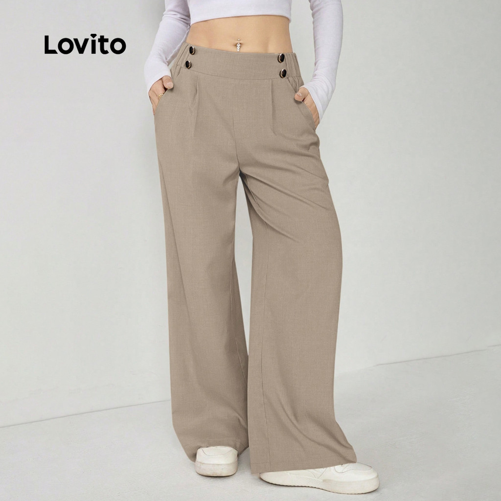 Lovito Calça Casual Feminina Cáqui Com Pregas E Botões Ideal Para Todas As Estações L171AD1149