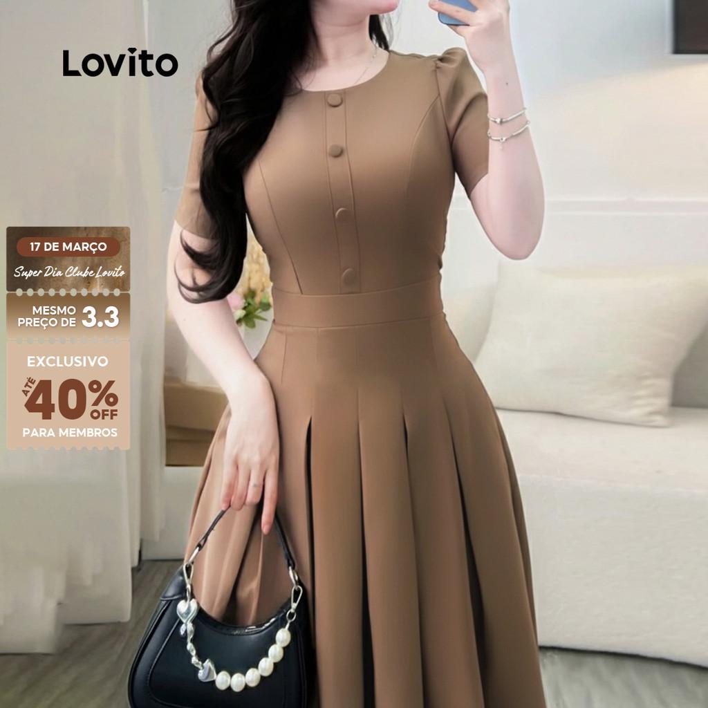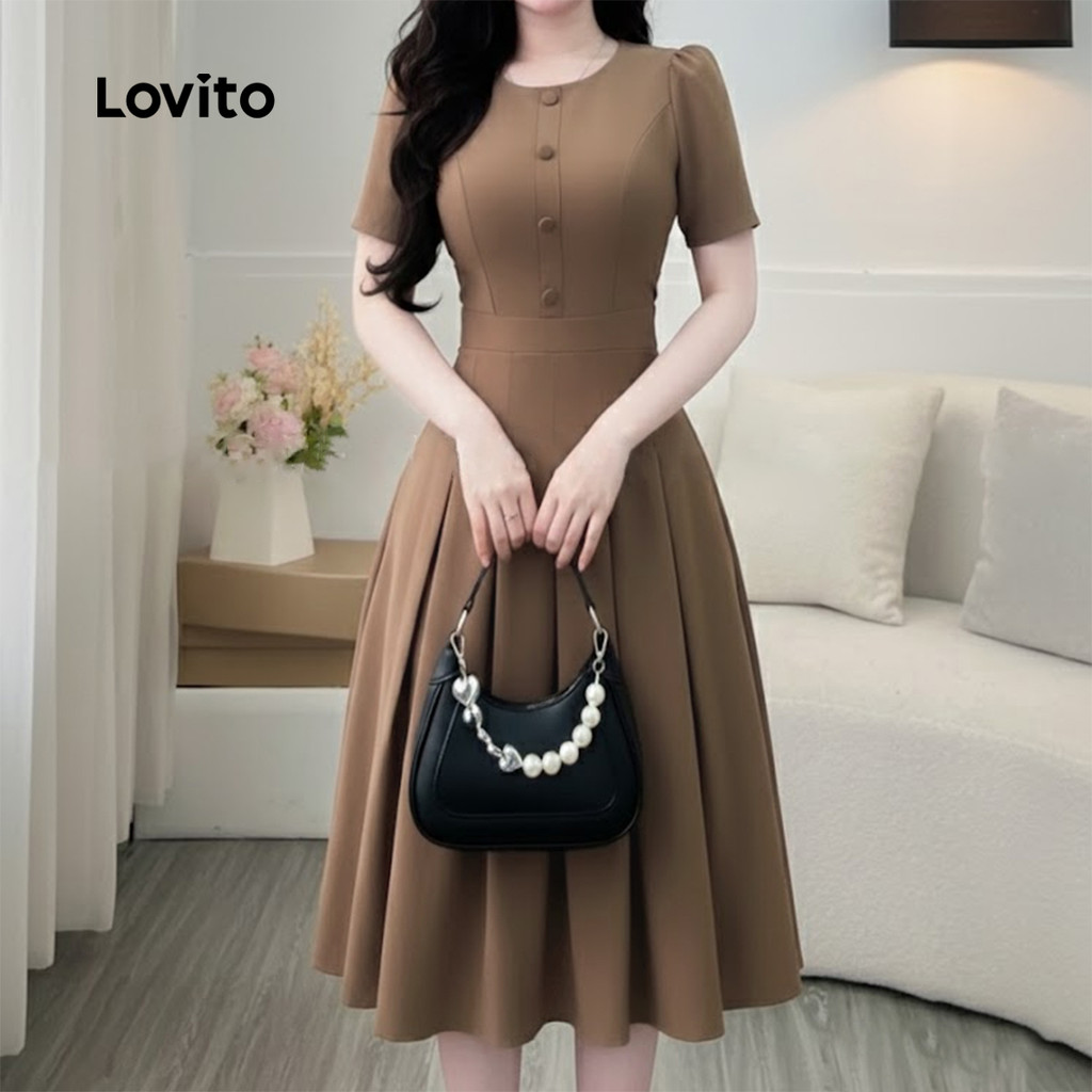 Lovito Vestido Casual Pregueado Botão Primavera/verão Marrom para Mulheres L164ED198