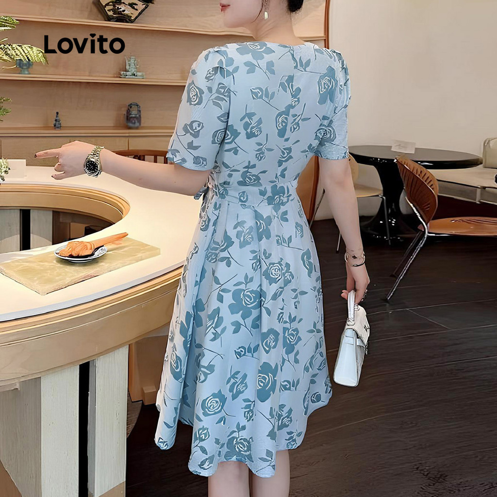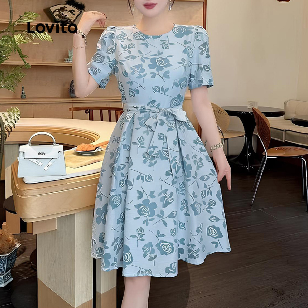 Lovito Vestido Casual com Cinto para Primavera/verão Azul para Mulheres LBL31212