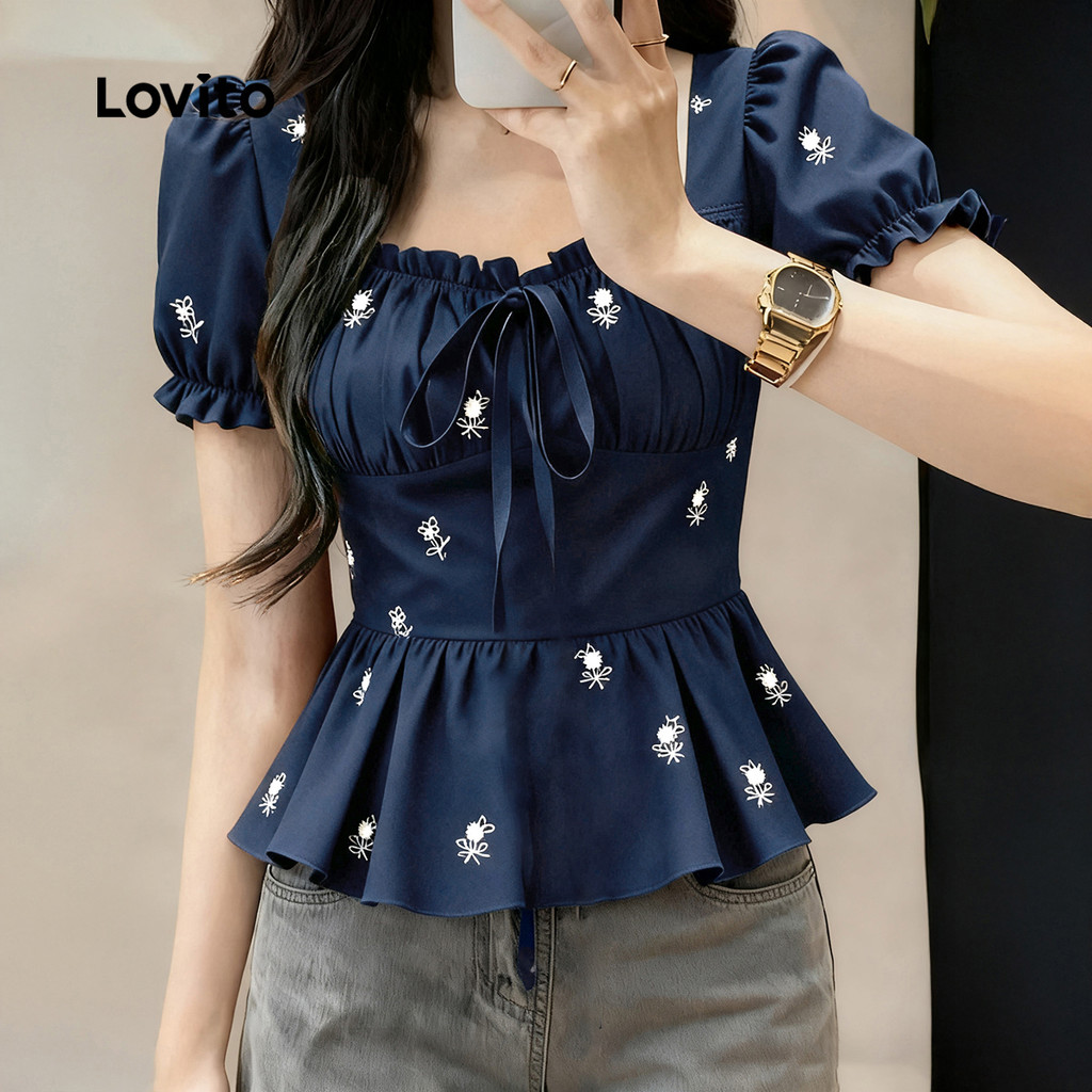 Lovito Blusa Casual Com Estampa Floral E Laço Azul Marinho Primavera/verão para Mulheres LK2ED1665