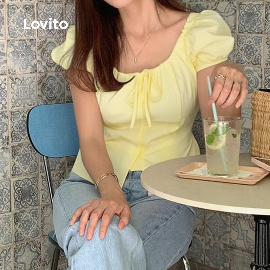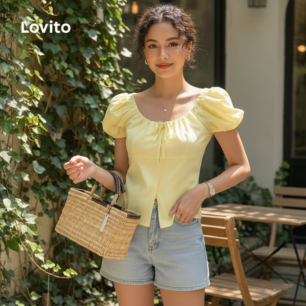Lovito Blusa Feminina Casual Amarela com Botões e Amarração Frontal para Primavera/Verão L137LD457