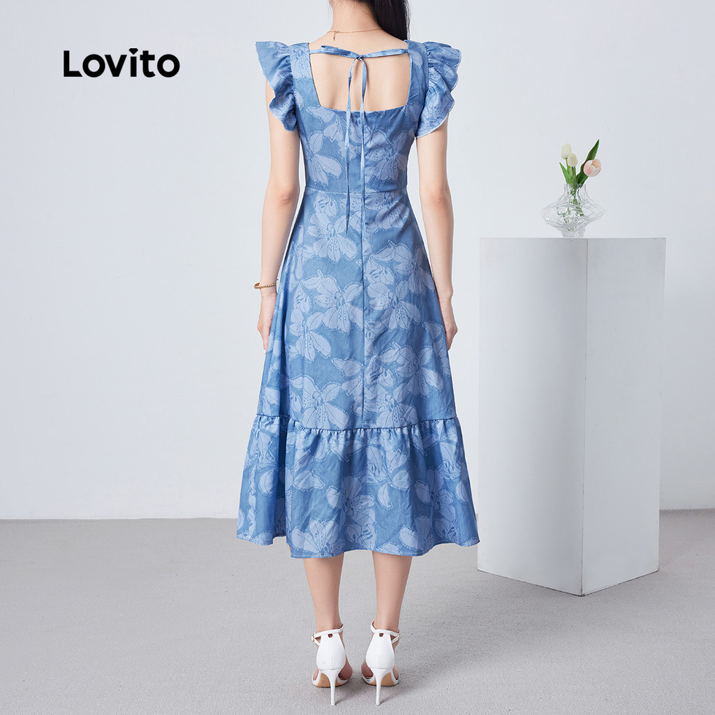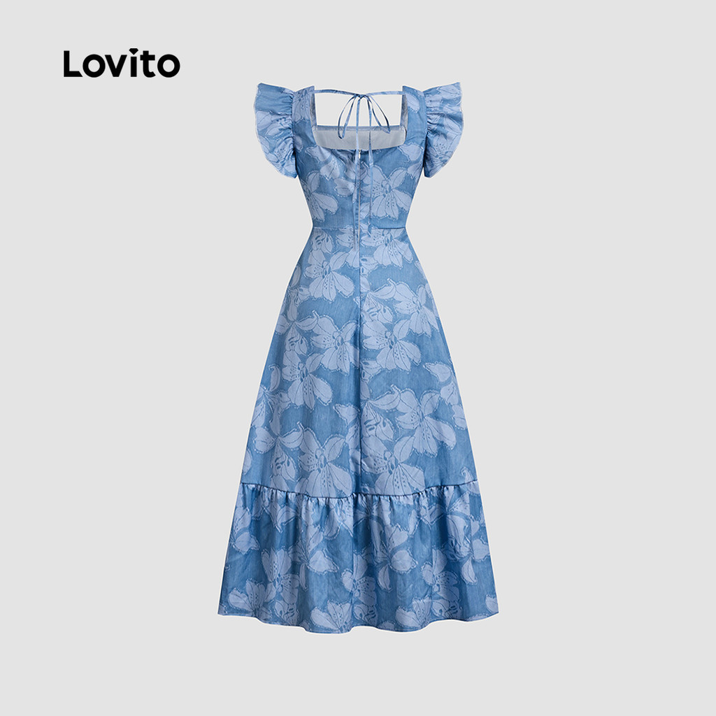 Lovito Refine Vestido Azul Casual Primavera Verão com Renda Laço e Babado Boa Textura LBL26329