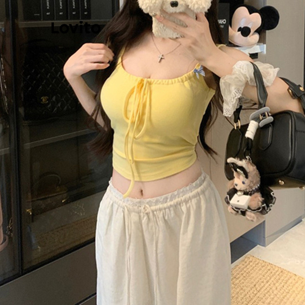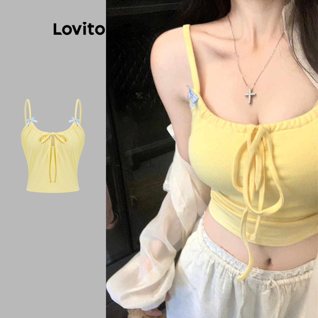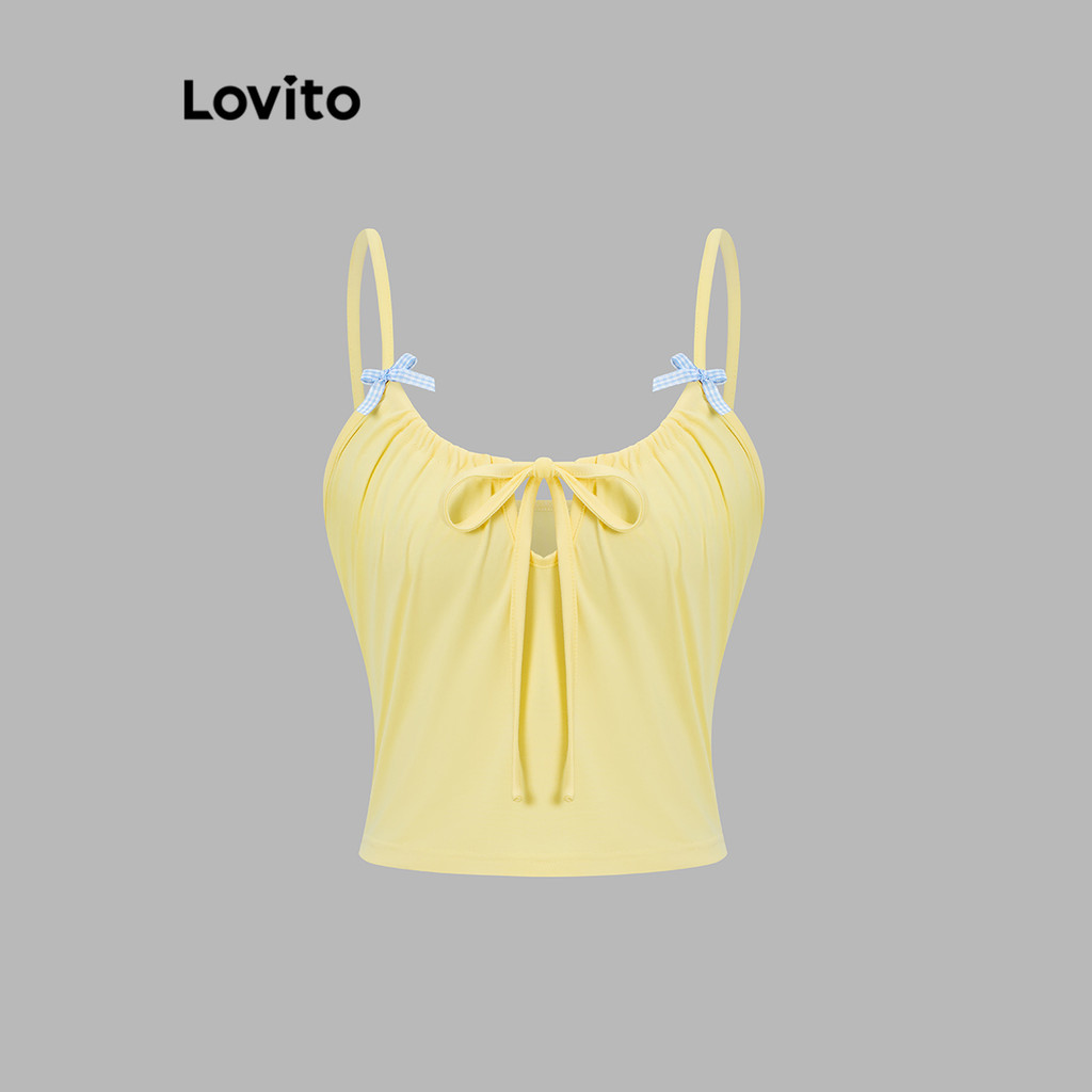 Lovito Blusa Fofa Com Laço Lisa Plissada Frente Para Mulheres L122AD010