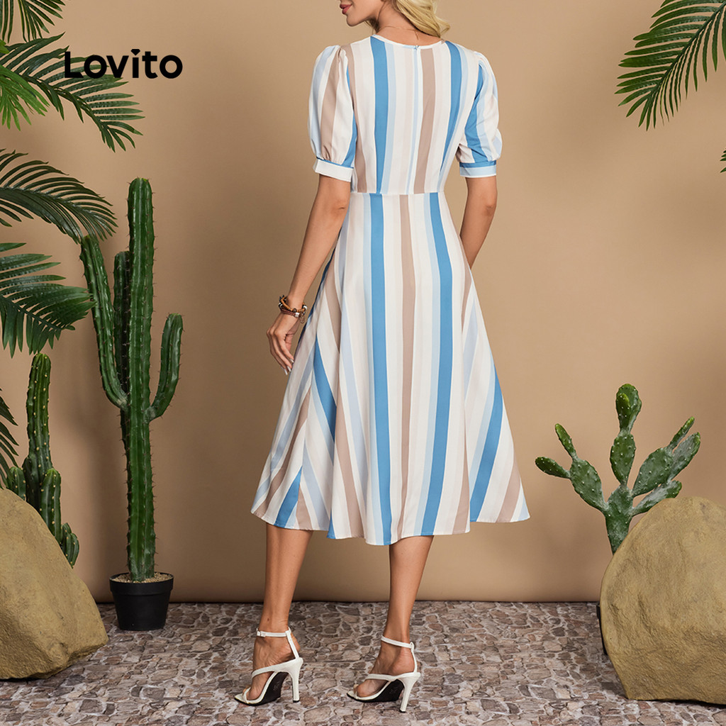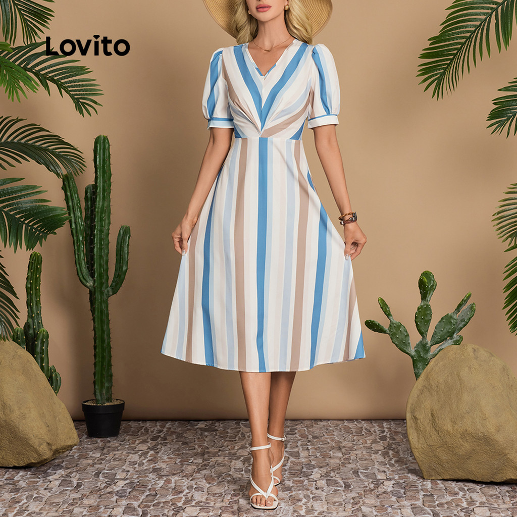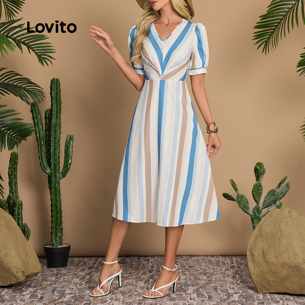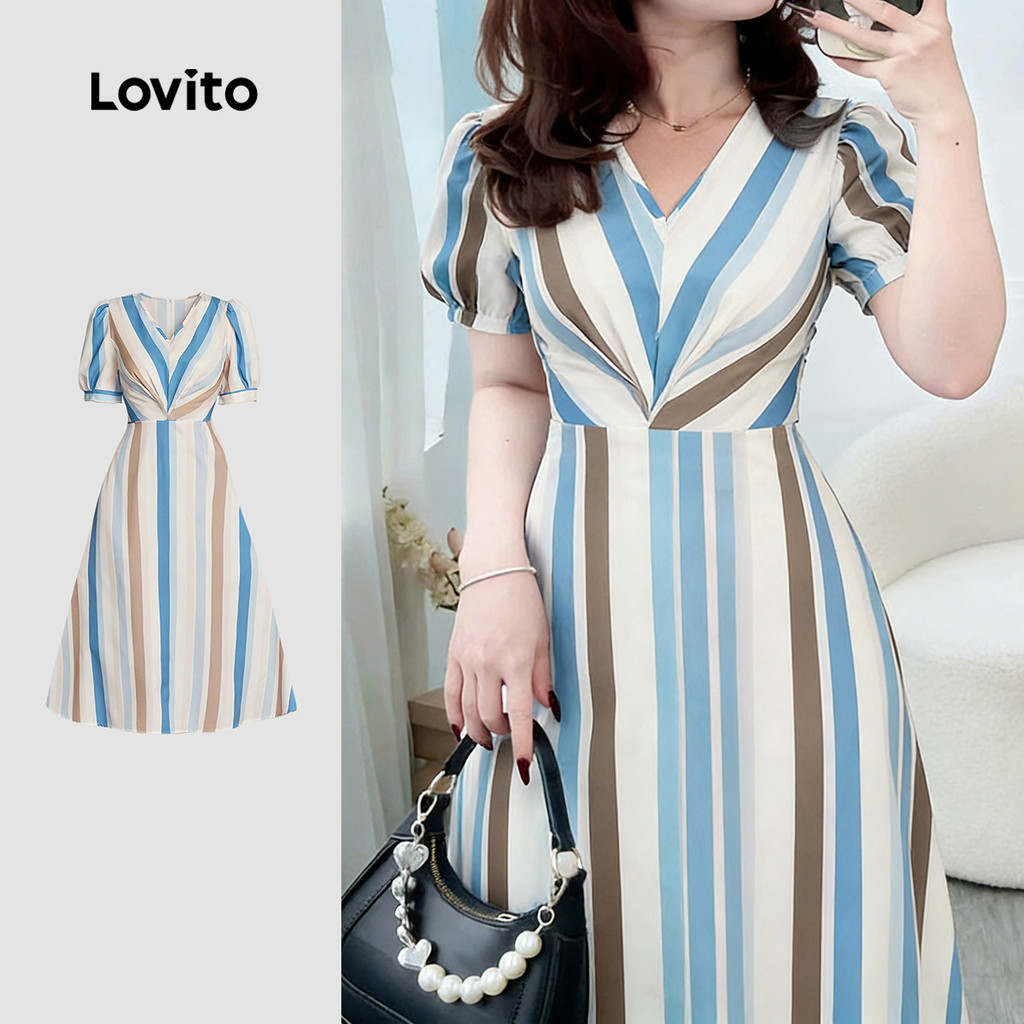 Lovito Casual Vestido Plissado com Listras Crepe Primavera Verão Feminino LBL32079