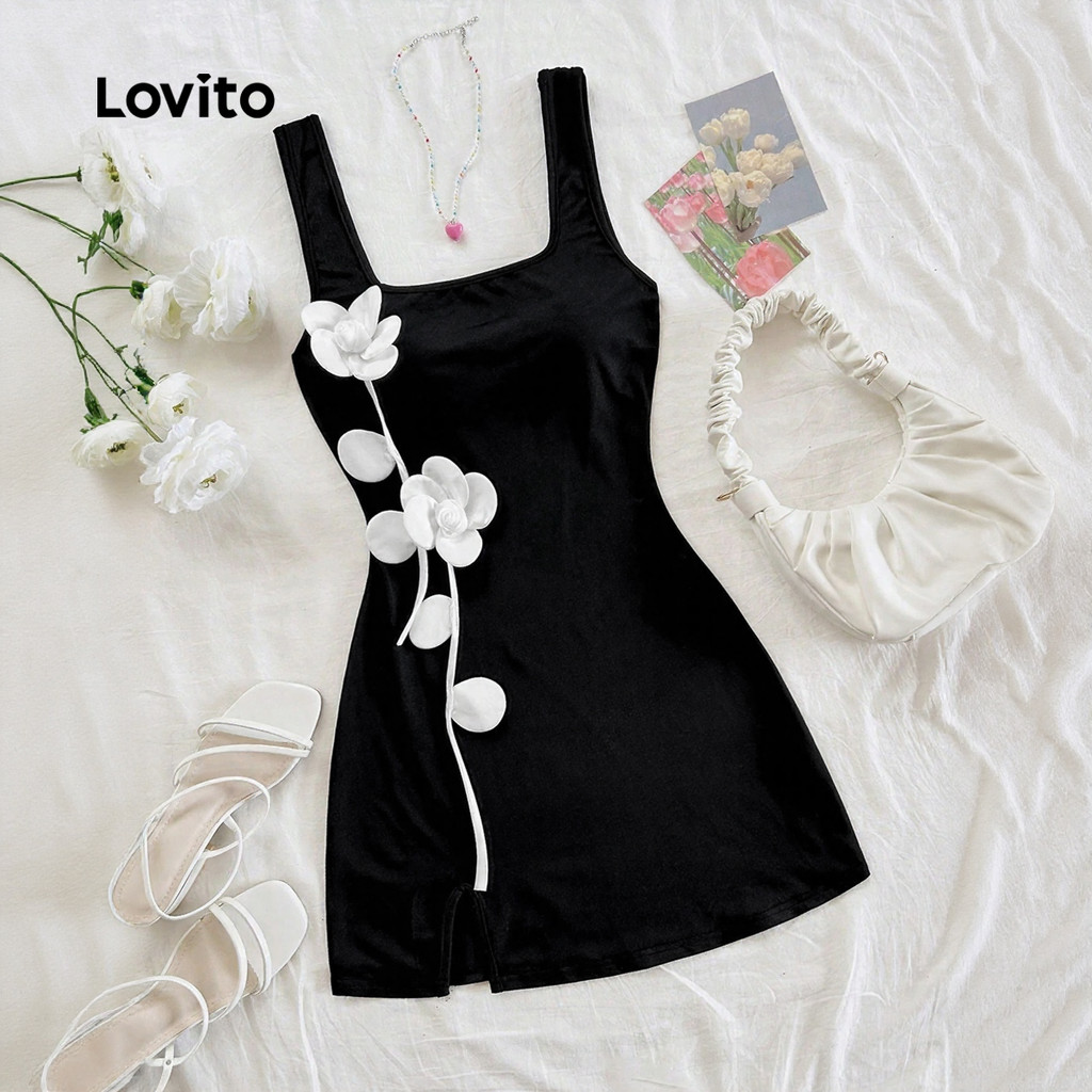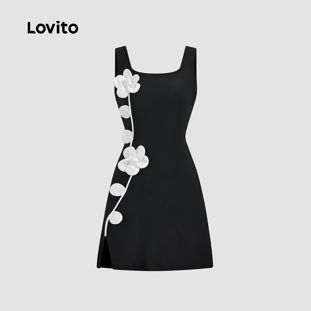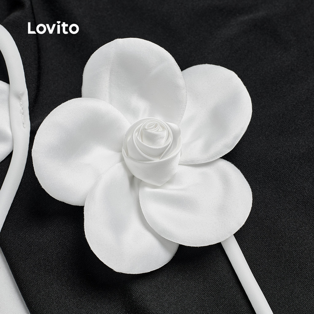 Lovito Vestido Preto Casual com Apliques Colorblock Primavera/verão para Mulheres L172LD1935