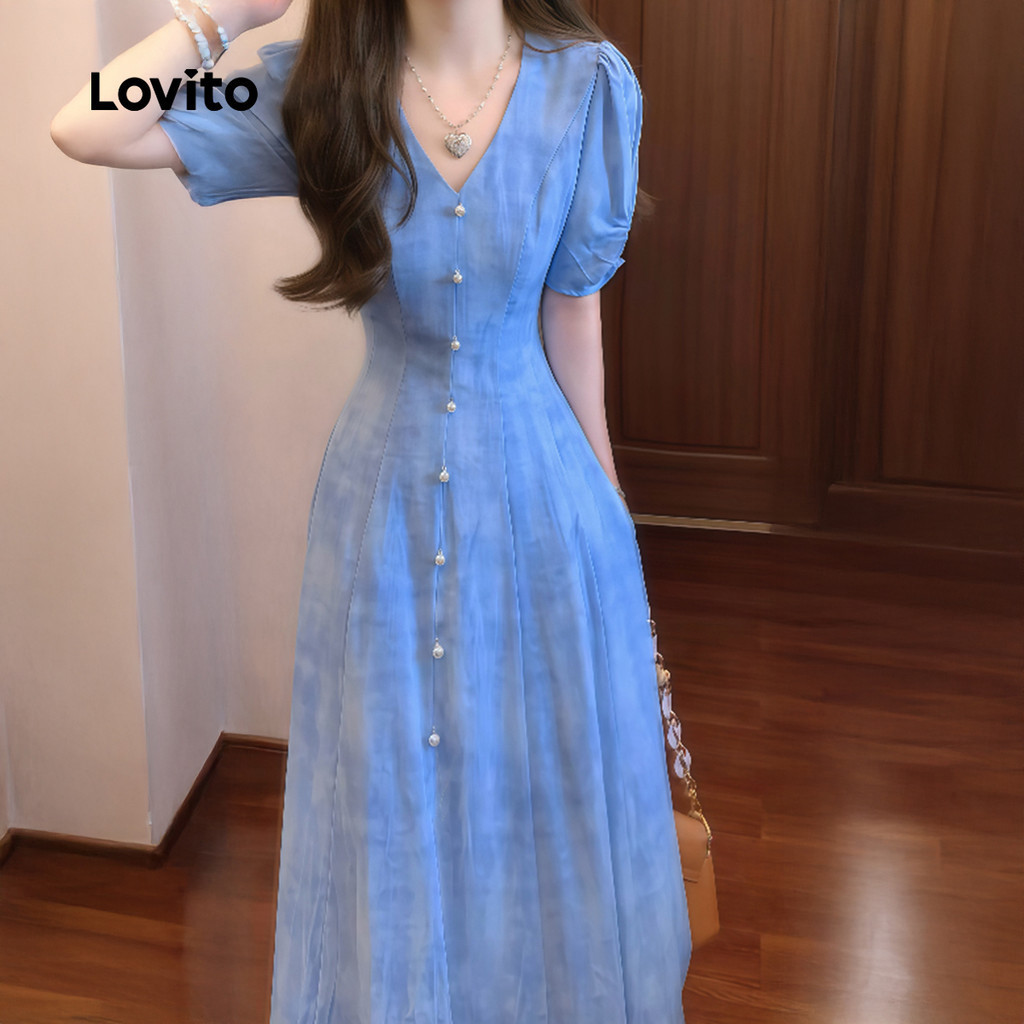 Lovito Vestido Casual com Botões para Primavera/verão Azul para mulheres L158AD190