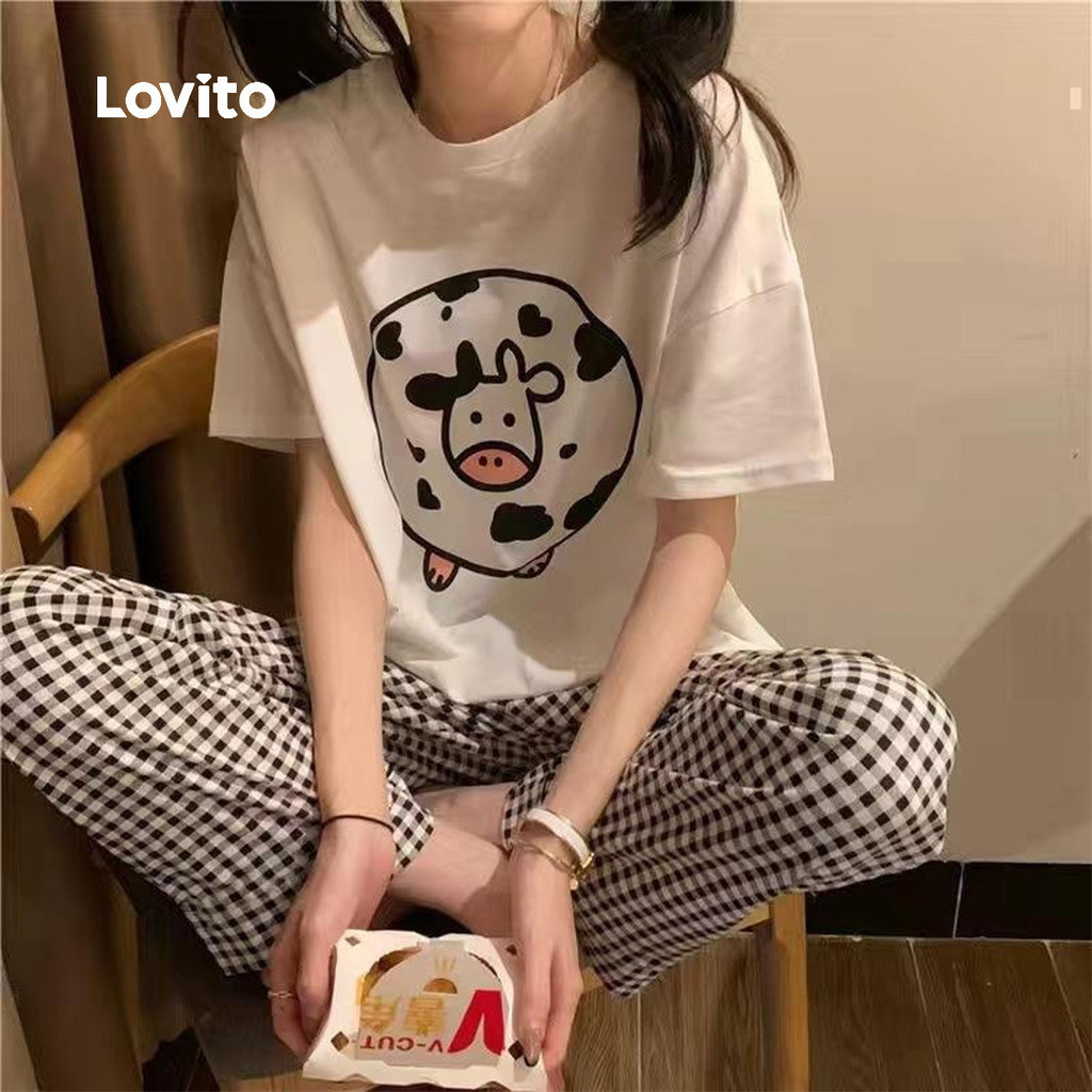 Lovito Pijama Feminino Casual 2 Peças Vaca Leiteira Solto Algodão Fresco LNE126135