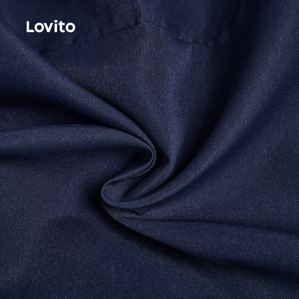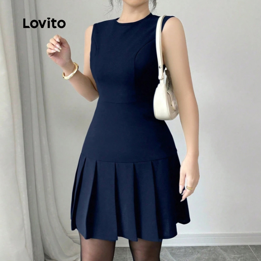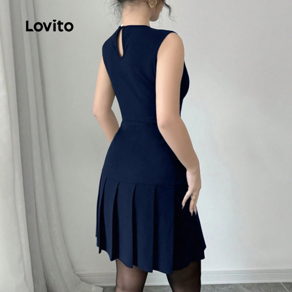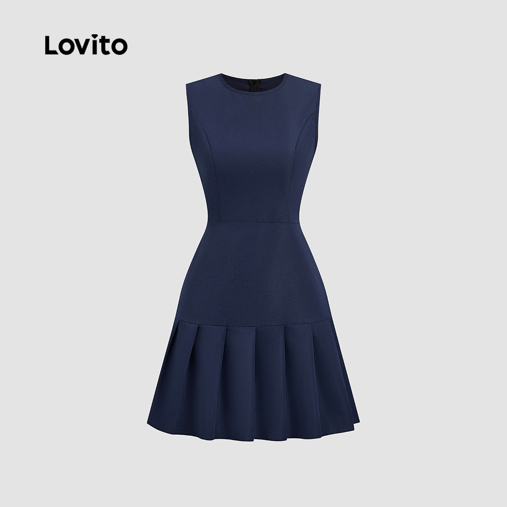 Lovito Vestido Casual Plissado Primavera/verão Vestido Azul Marinho para Mulheres L166AD405