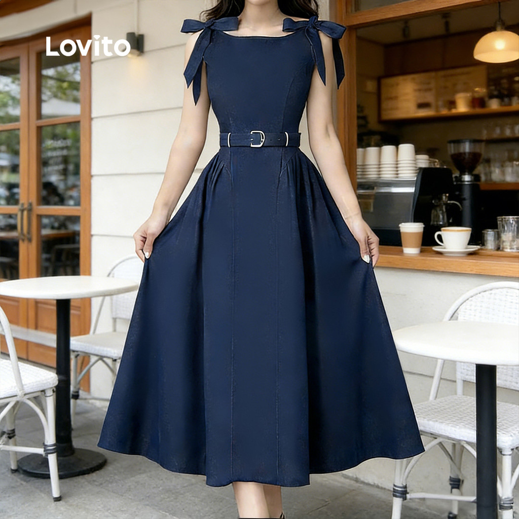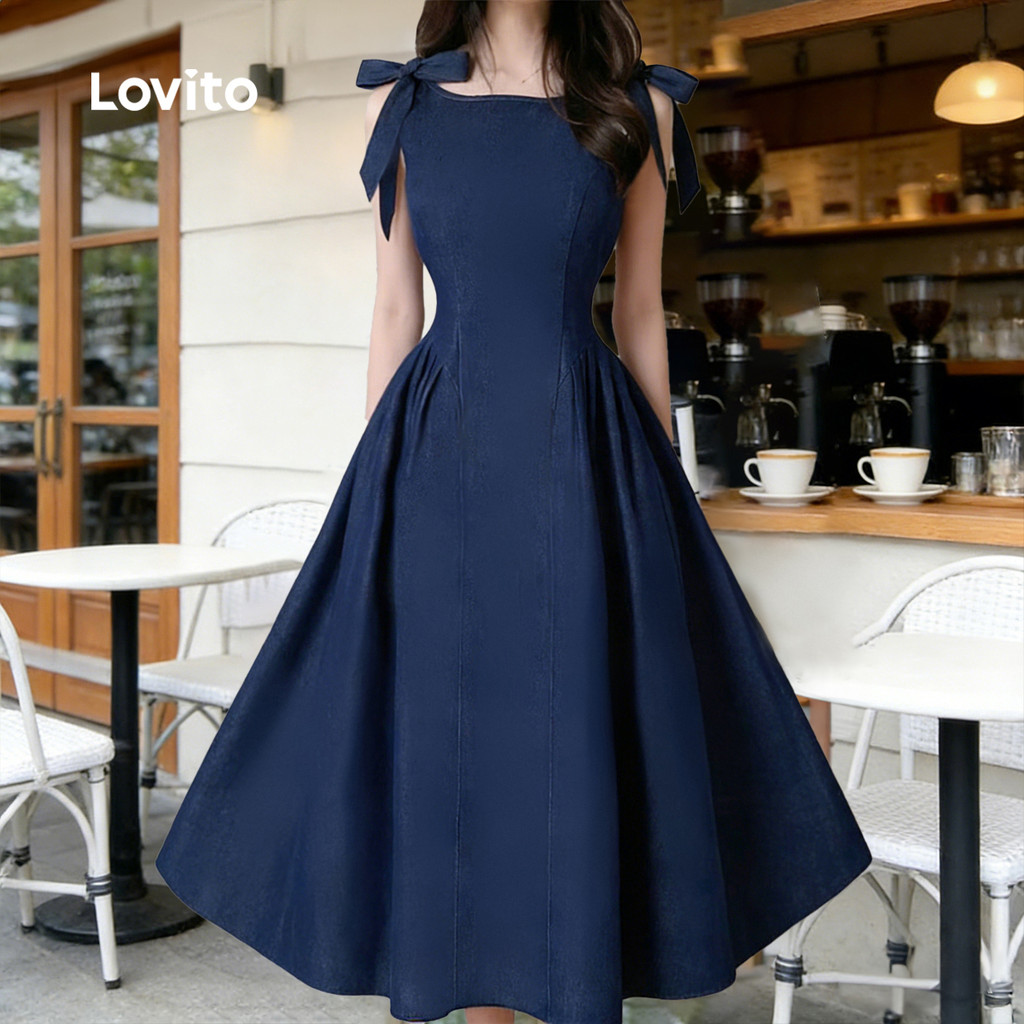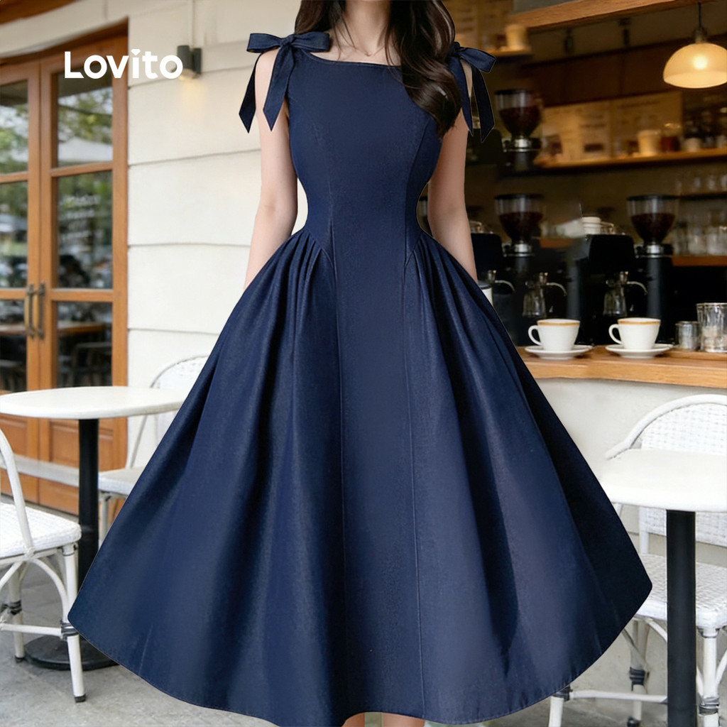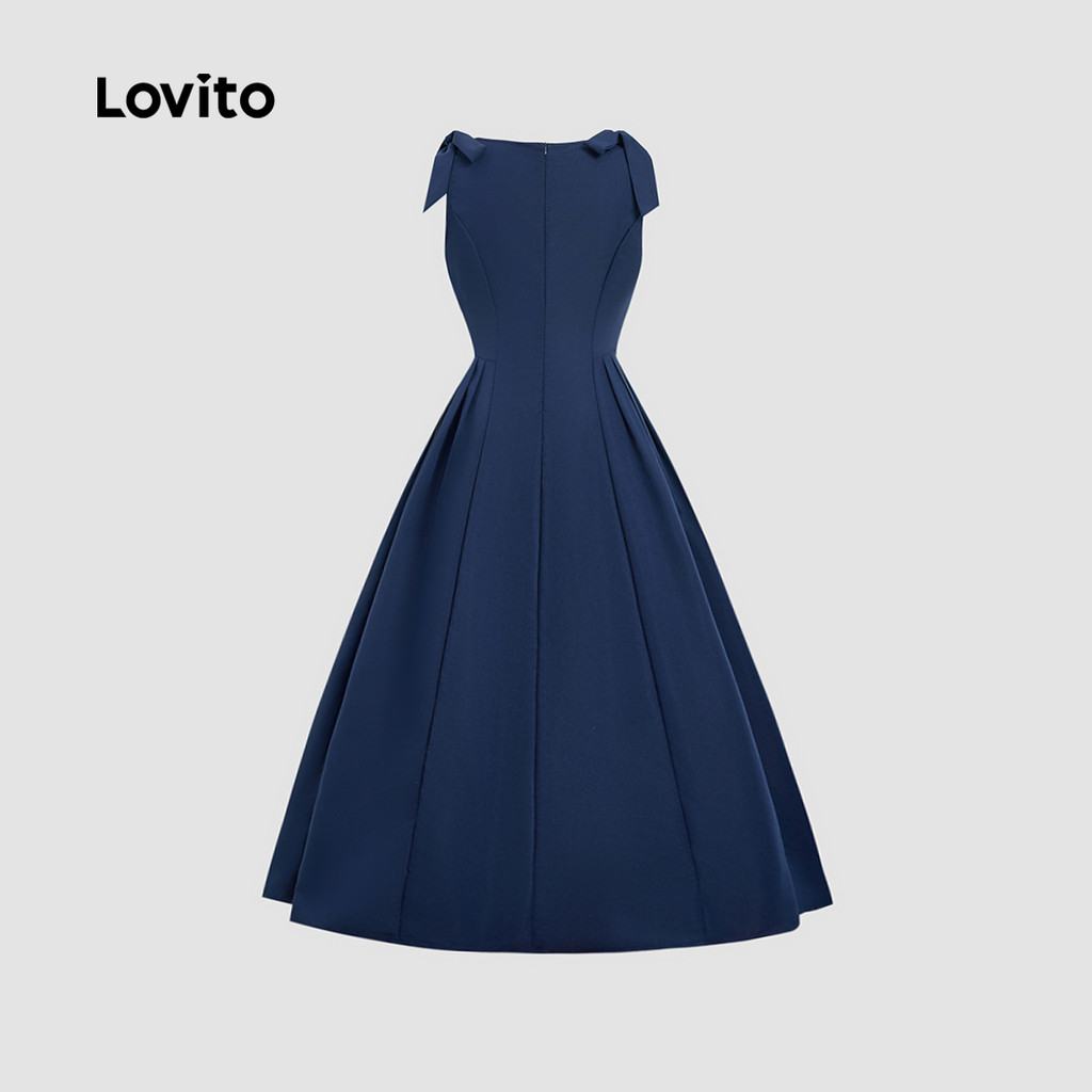 Lovito Vestido Casual com Laço Zíper e Renda para Primavera/verão Azul Marinho para Mulheres L178ED1207