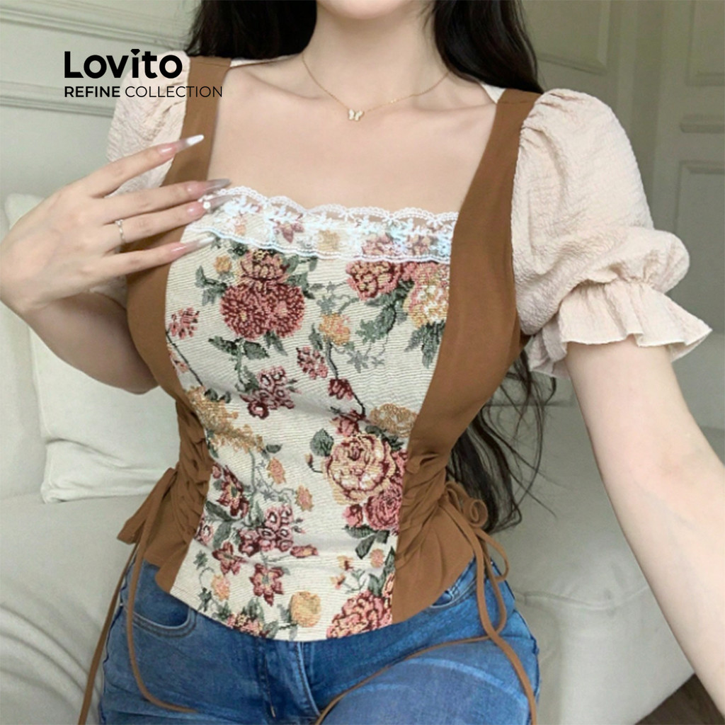 (Lovito Refine) Blusa Boho em Tecido Costura Blocagem de Cores Blusa de Primavera/verão para mulheres LR23E002