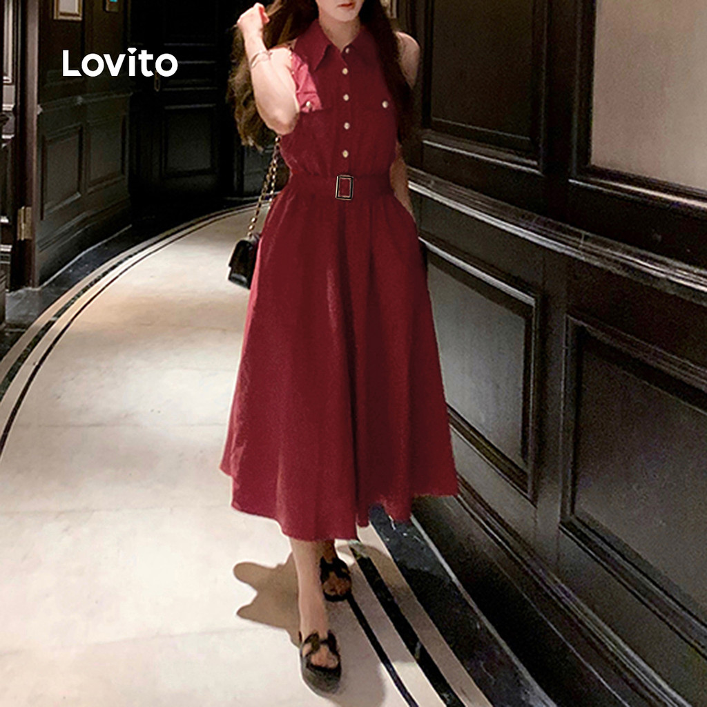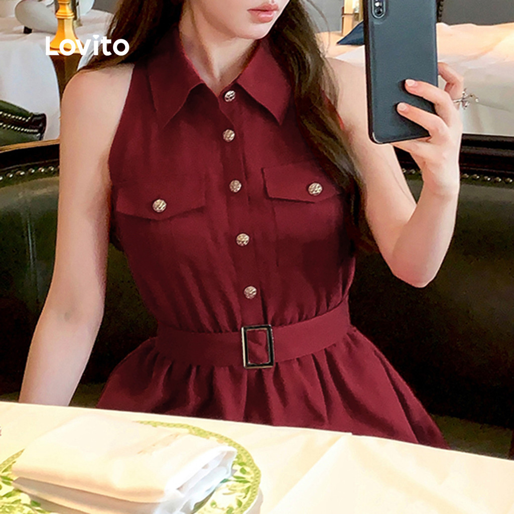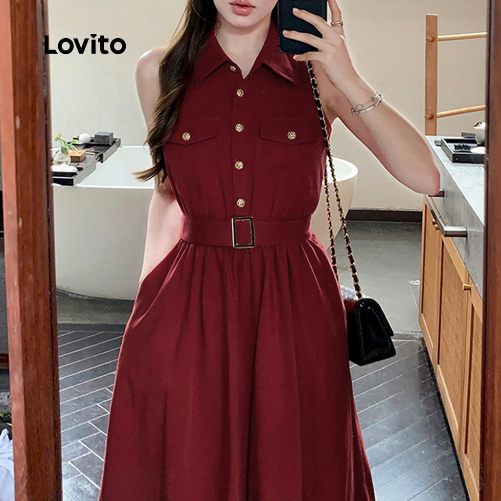 Lovito Vestido Casual Com Botões E Bolsos Cor Vinho Para Primavera/verão LK2ED823