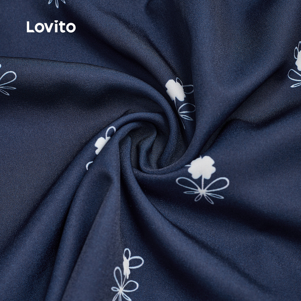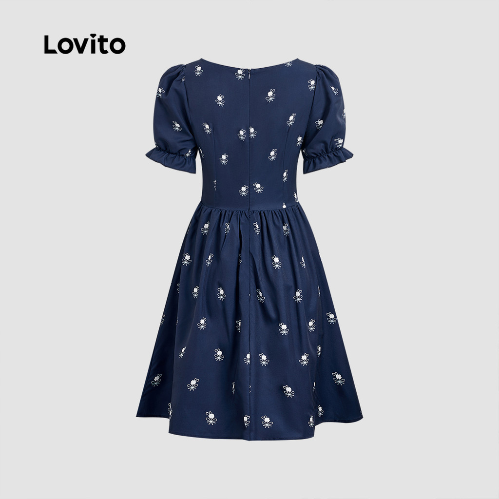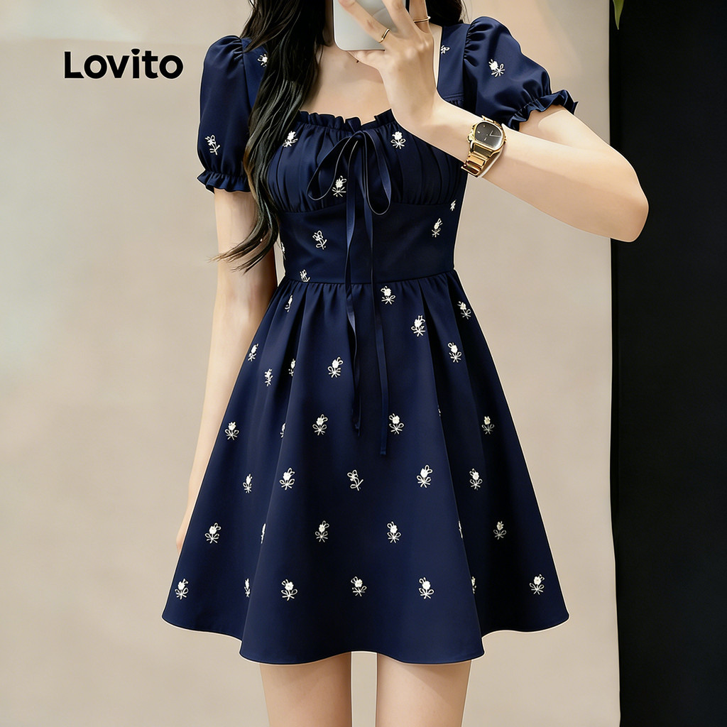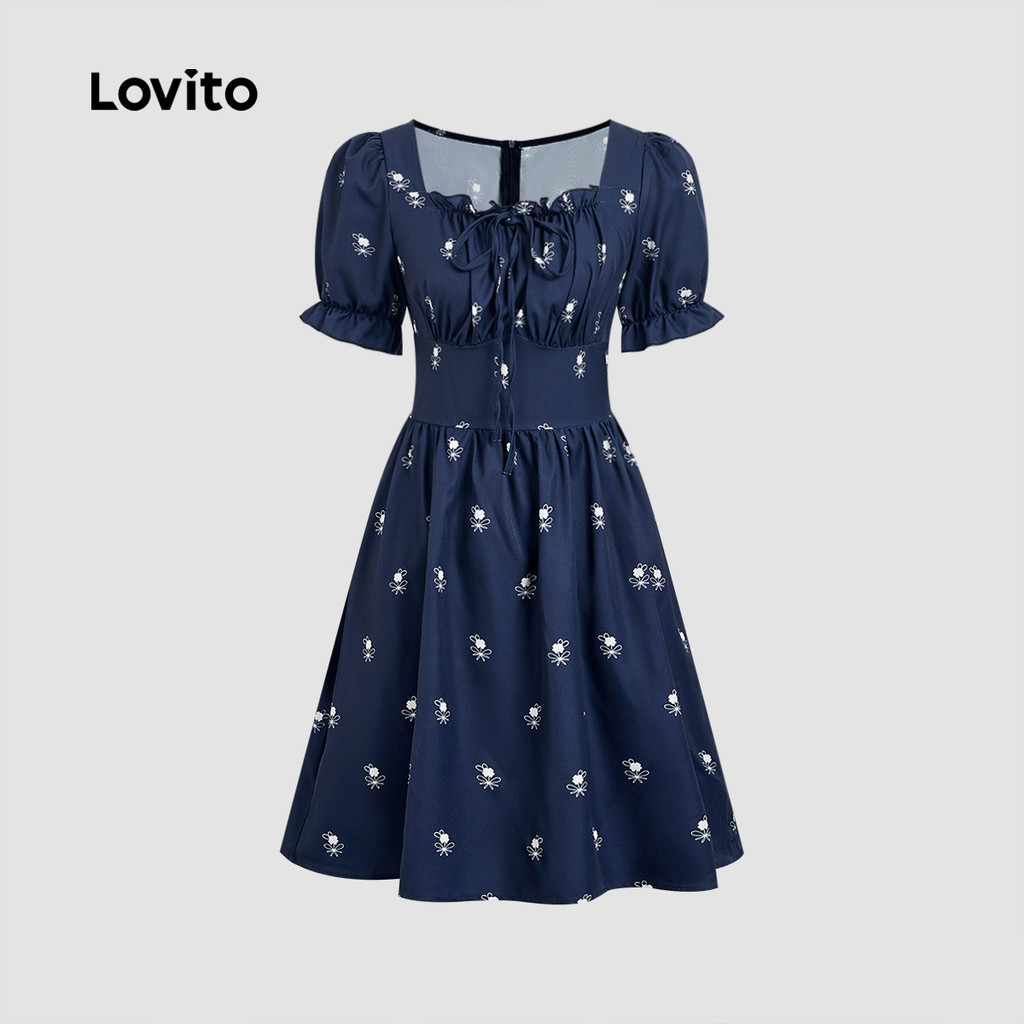 Lovito Vestido Casual com Amarração e Babados para Primavera/verão Azul Marinho para Mulheres LBL33053