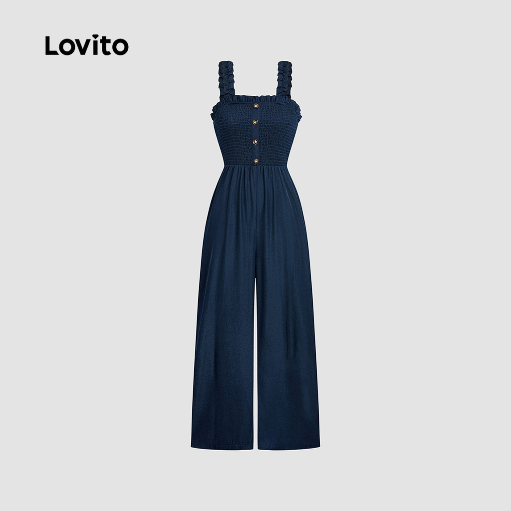Lovito Macacão Smocked Feminino Azul para Primavera/verão LBL31009