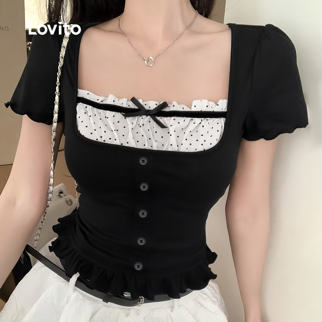 Lovito Camisa Casual 2 em 1 com Laço Contrastante e Faixa para Verão Camiseta preta L139AD016