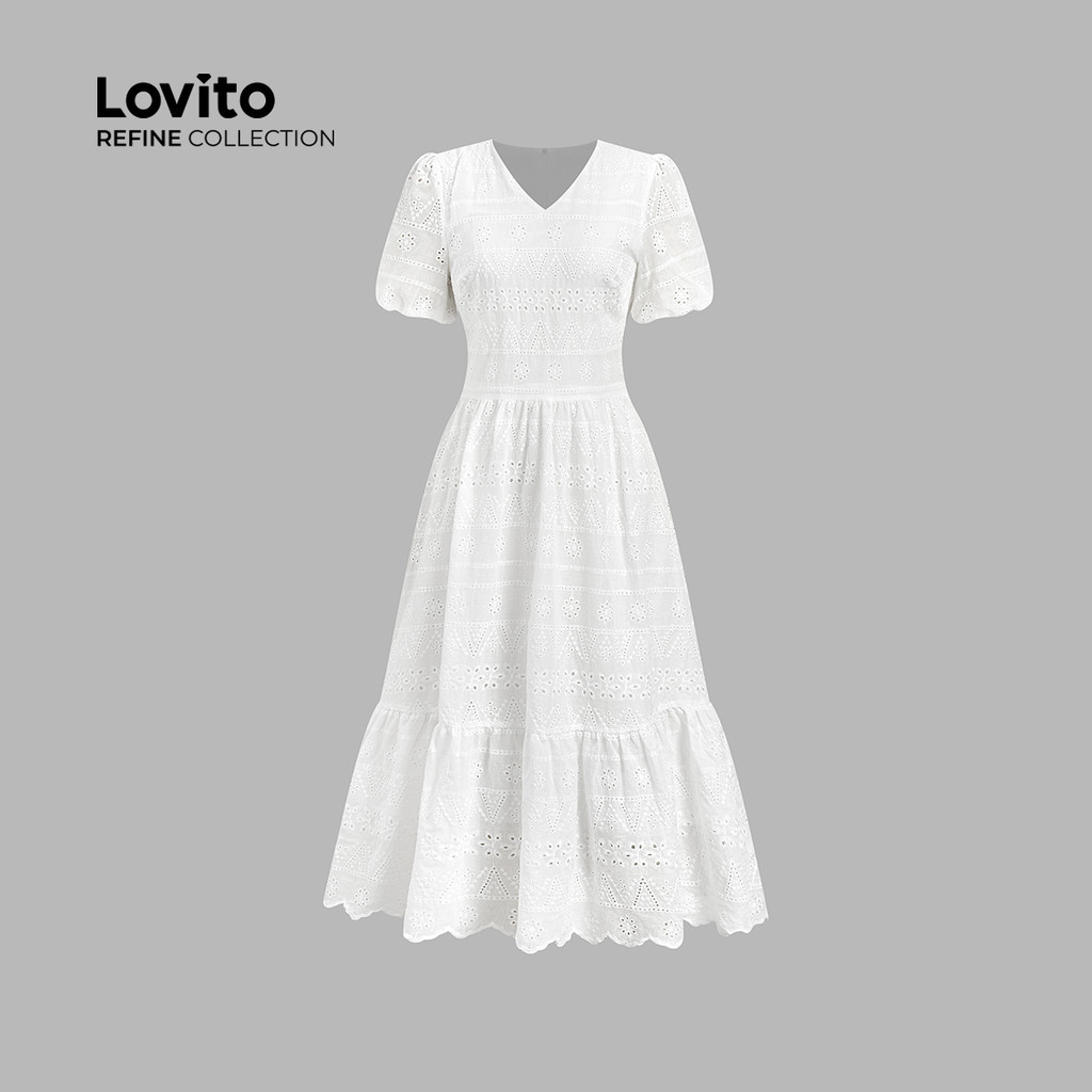 (Lovito Refine) Vestido Casual Em Algodão Bordado Com Ilhós Branco Para Primavera/verão Ideal Para Mulheres LR26ED067