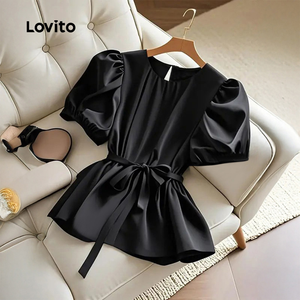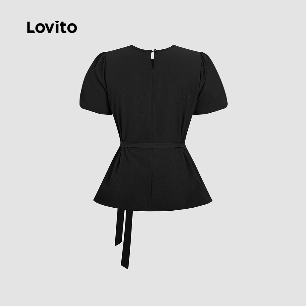 Lovito Blusa Feminina com Renda e Pregas - Primavera/verão Preta L166AD256