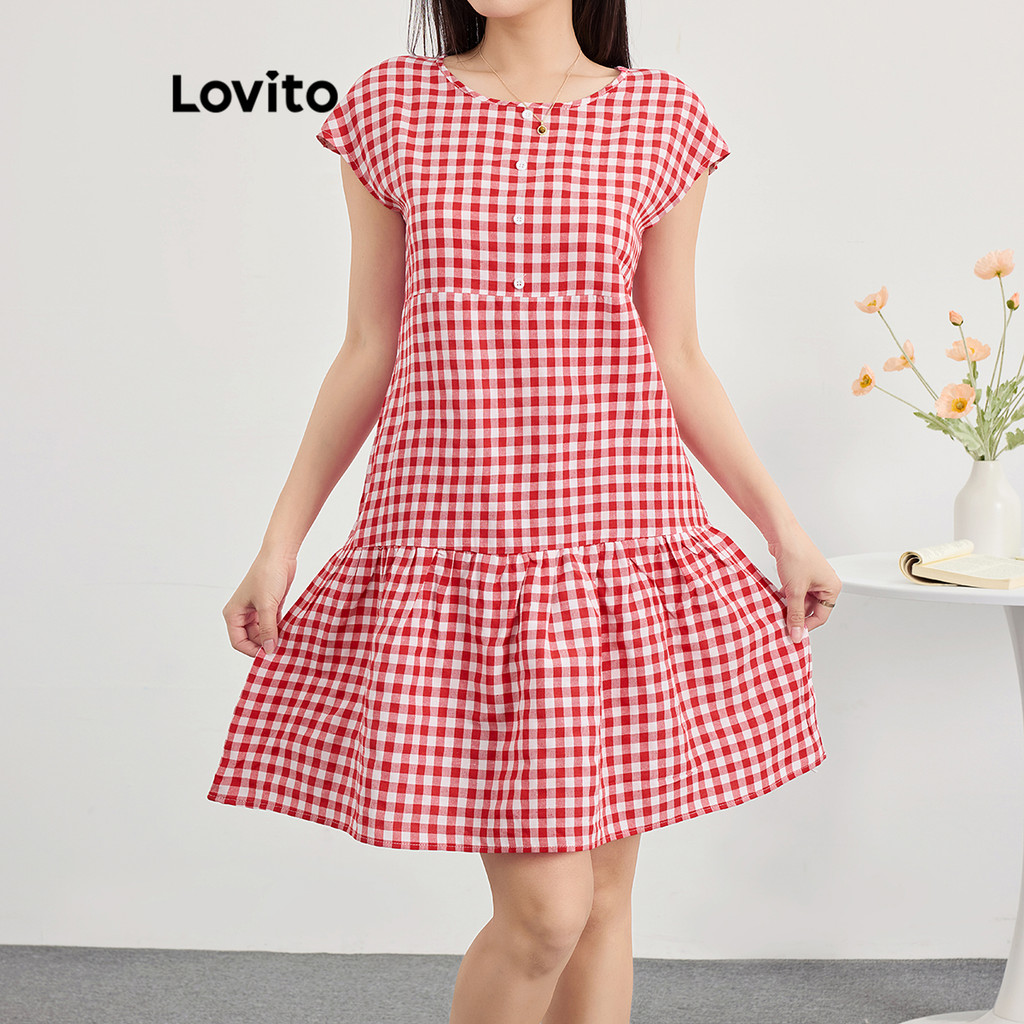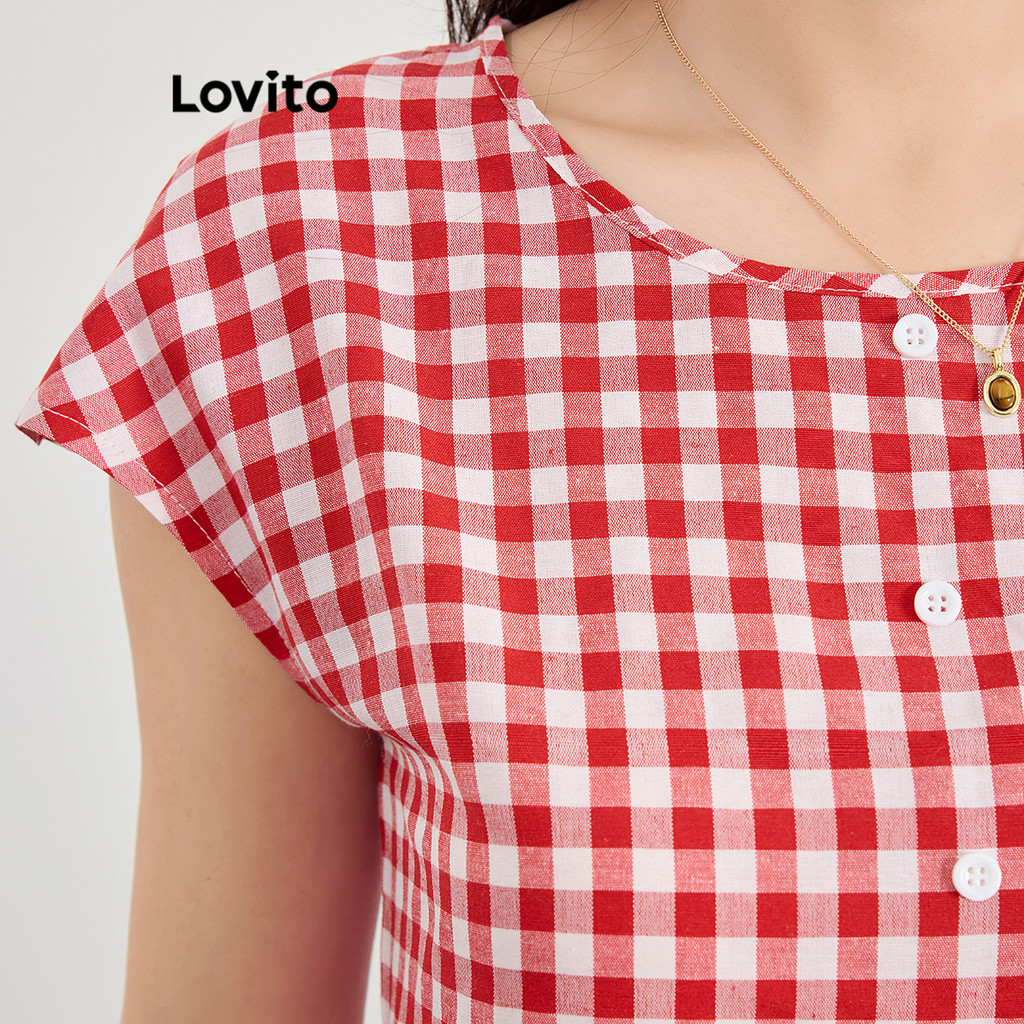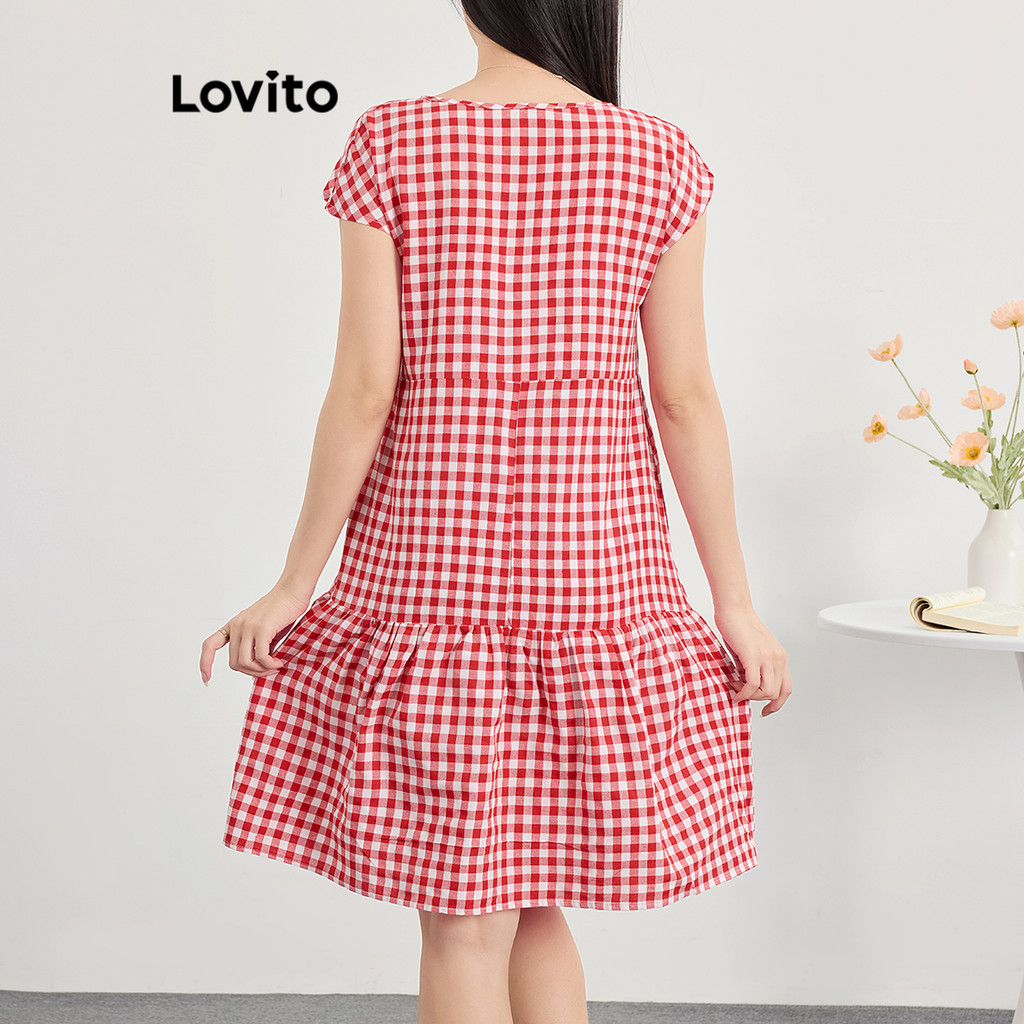 Lovito Vestido feminino casual com estampa xadrez e botões em camadas L120ED1379