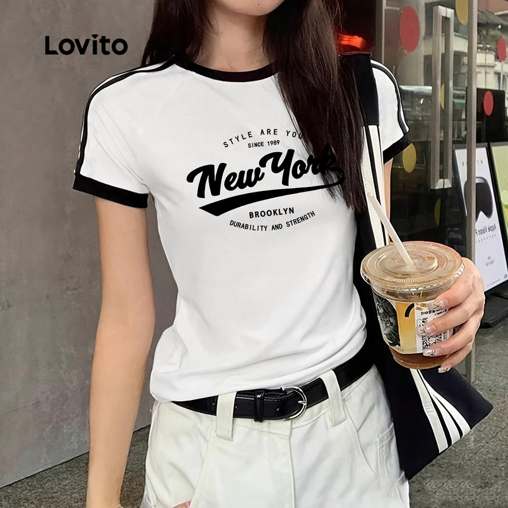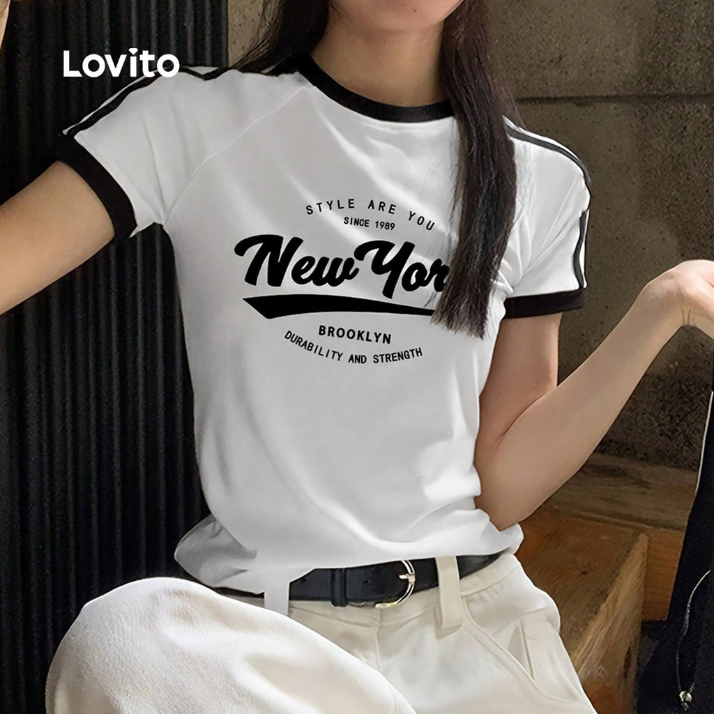 Lovito Camiseta Casual Colorblock Primavera/verão Branco Off para Mulheres L164ED366