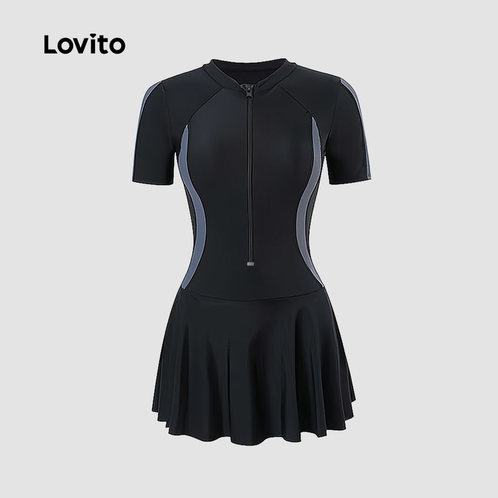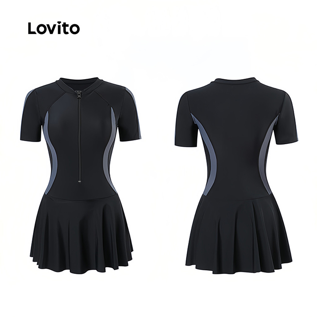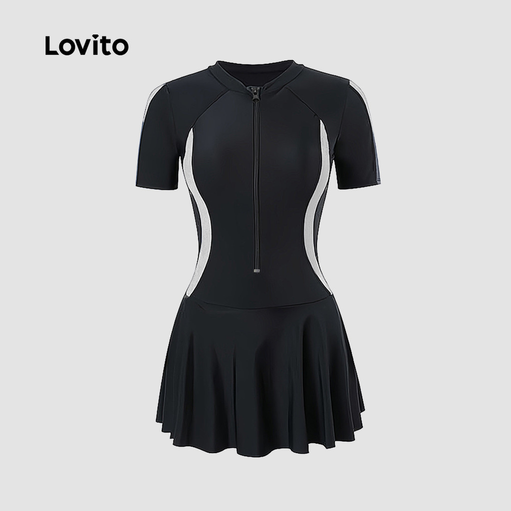 Lovito Maiô Esportivo Preto e Branco Colorblock Zíper Primavera/Verão LNE141049