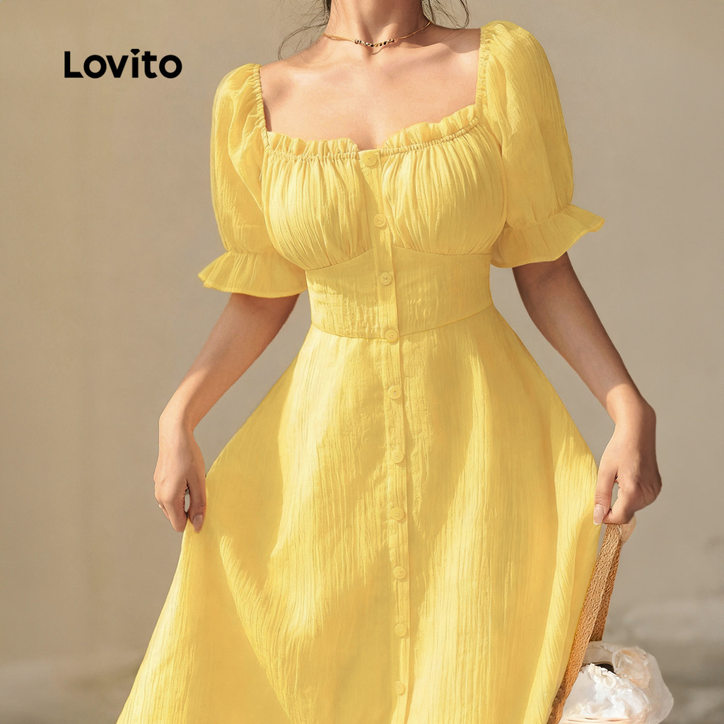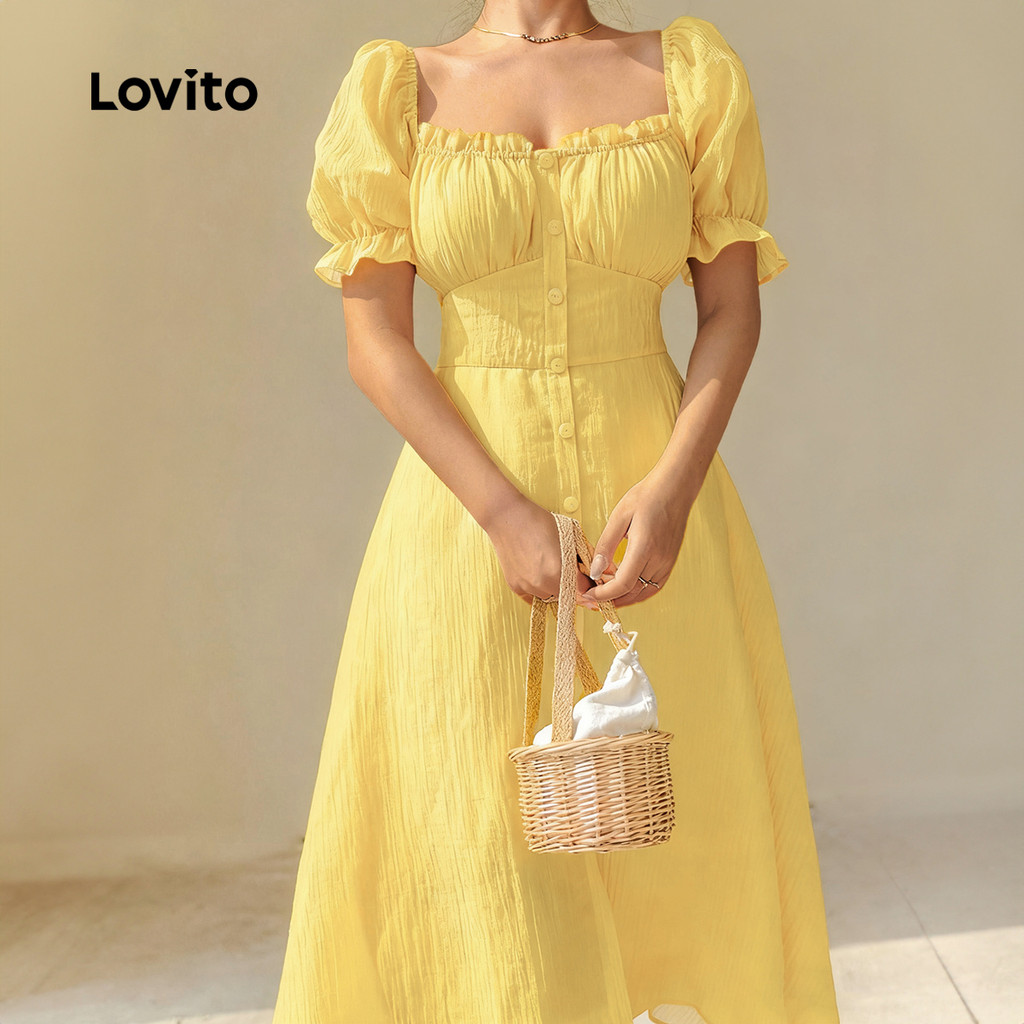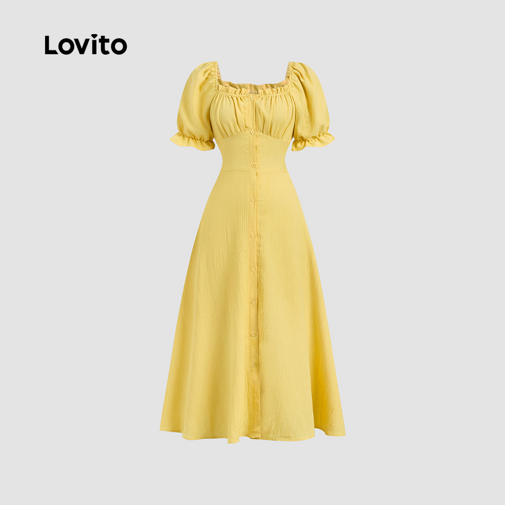 Lovito Vestido Longo Amarelo Elegante Com Botões Estilo Evangélico Para Mulheres Ideal Para Primavera/Verão LBL29165
