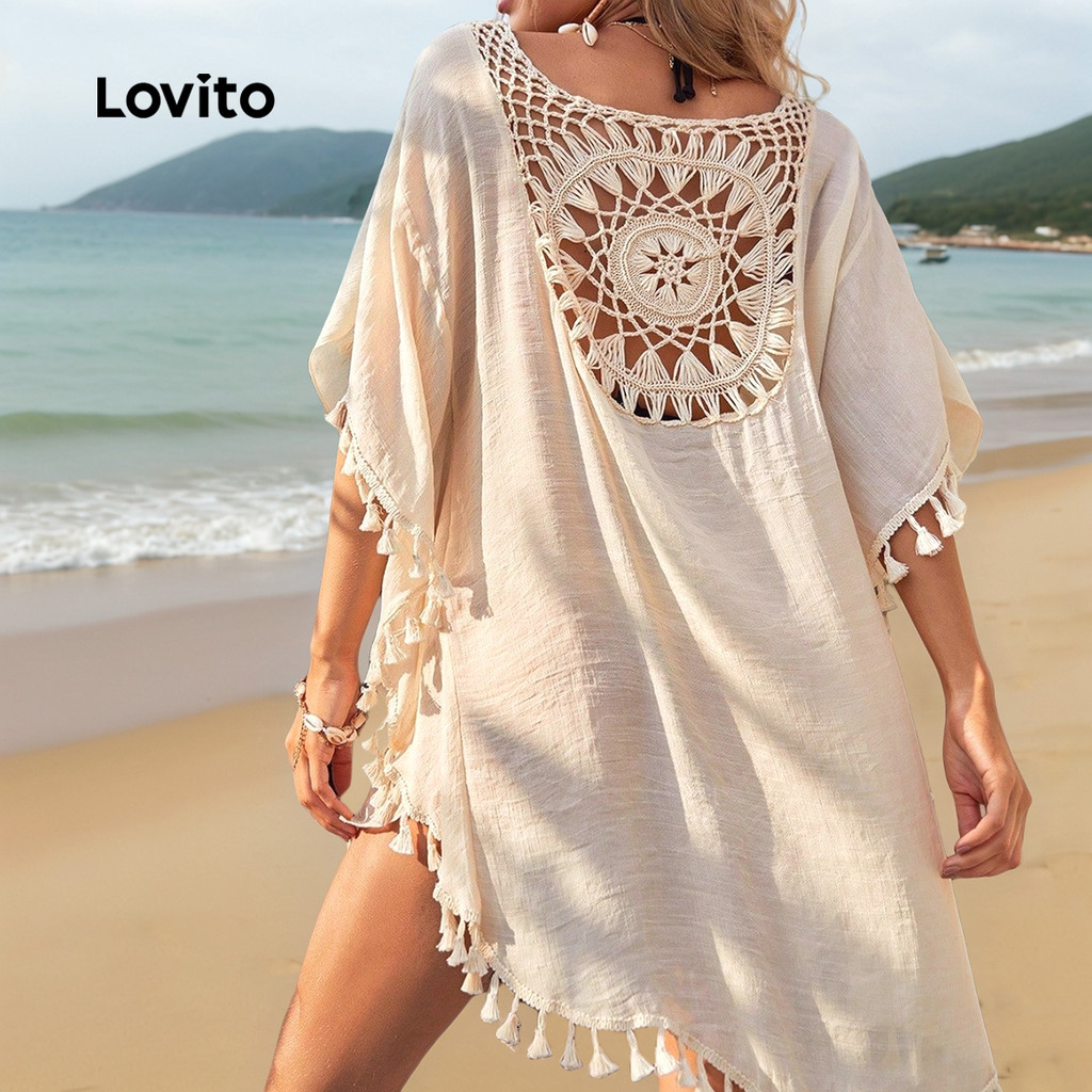Lovito Kimono Boho com Franjas Estilo Resort Primavera/verão Damasco para Mulheres LNL126261