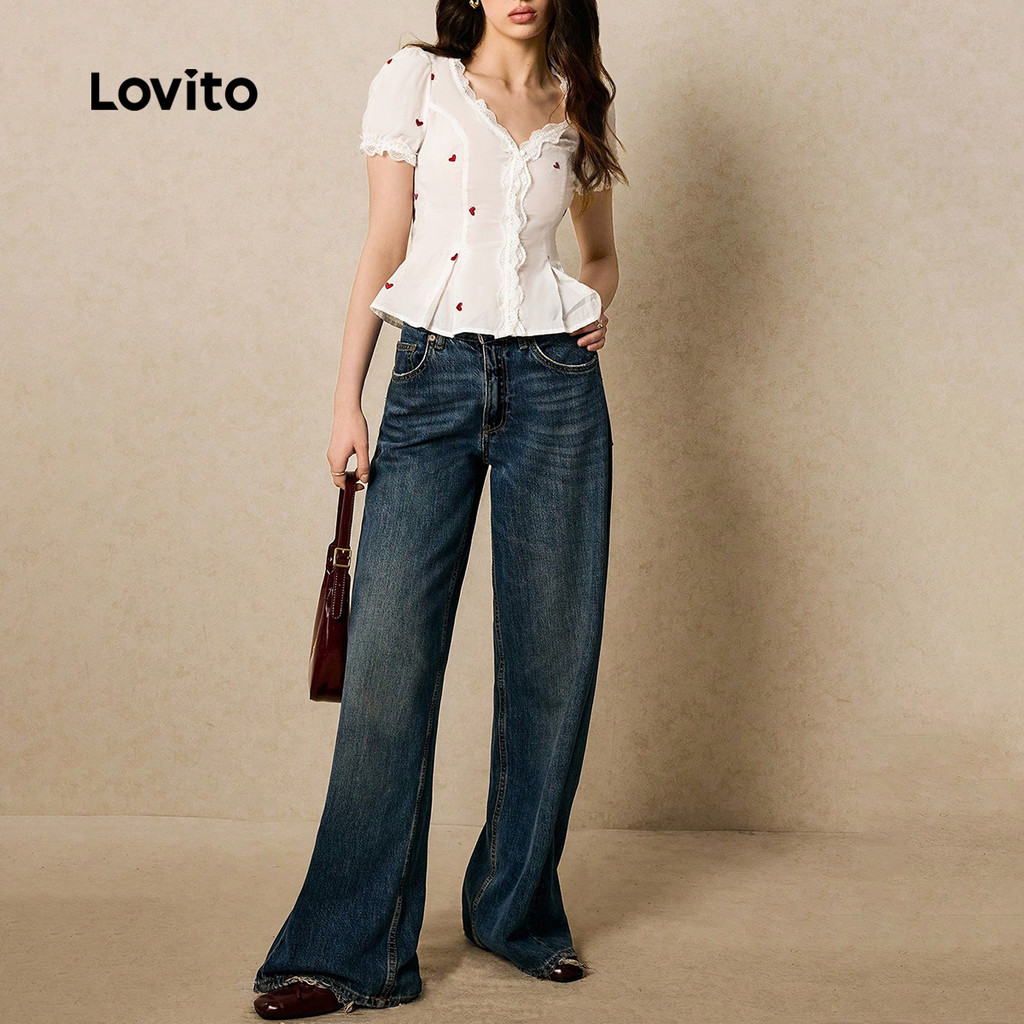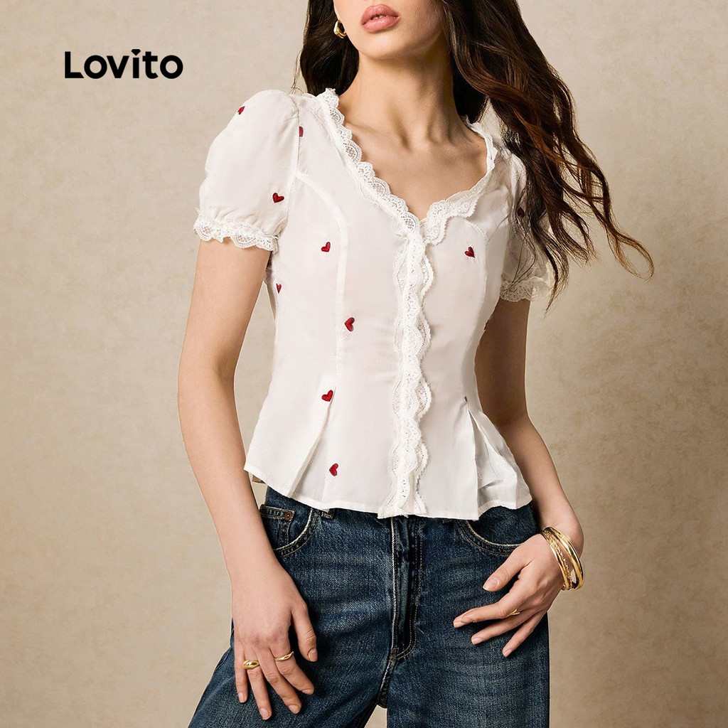 Lovito Blusa Casual de Renda com Botões Primavera/verão Blusa Branca para Mulheres L171ED115