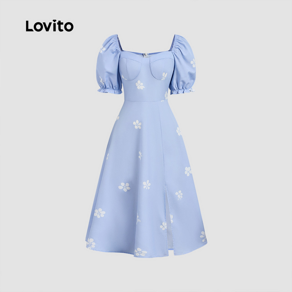 Lovito Vestido Feminino Azul Estilo Boho Evangélico Com Abertura Para Primavera Verão LBL30083